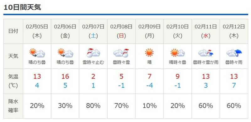 (c)tenki.jp金曜日から土曜日の落差がとんでもないことになってるな、と。みるだけで気分よろしくなくなりそうです。週明けの最低気温-4度というのもあまり見ない数字です。体調管理おだいじに。