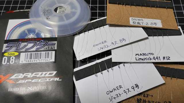 ヨーロッパ、特に東欧地域に主に輸出されている釣針です。日本でも小物釣用の針として人気が出てきています。(メーカーWebページより)長めの軸に丸みの強いフトコロ形状。サイズは#22~#14の5段階、海外向けが主らしく数字が大きくなるほど小さい寸法。丸軸 ヒネリ無し ニッケルメッキ丸海津、あるいは湘南キス、ショットキス(がまかつ)や競技キスSP(ササメ)などを思わせる形状ですが大きさが別物。小さく細い鈎です。線材の径は大きいほうから#14-0.34mm、#16-0.28mm、#18#20-0.26mm、#22は記載無しサイズ的にがまかつ競技キスSP4号に相当するのは#16か。一段小さい#18はまあなんとか扱えそう。#20と#22ははたして私に扱いきれるのかどうか#22 #20 #18 #16 #14がまかつ競技キスSP4号 D1040#18 #16 #14 がまかつ袖4号D1040#22 #20 #18 がまかつ袖1号 袖2号#182025.11.14#22#20にホンテロン0.4号を結んでみました。各4本。0.6号では締込みが安定しない印象。すんなりと、とは言えませんがなんとかなりました。思いのほか私のハリス結びの技量が上がっている感じであります。#22 ホンテロン0.4号