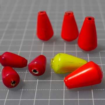 ナツメ型の中通しオモリを半分に割ったらなんか好みに近い形状になりそうだと思いまして。寒くなる前のエアコン不要期に塗装しておいた物のいくらかに熱収縮チューブを施してからブラクリ風仕掛けに仕立てました。市販のブラクリ仕掛けでよく見る型とナス型との間といった形状です。材料としたのは第一精工の中通しオモリ0.8号~2号。ペンチによる手作業切断なので大きさの精度はありません。重さいろいろ。着色・仕上は蛍光塗装ベースに透明チューブだったり、白色ベースに赤チューブだったり。撮影して拡大してしまうとちょいとアラが目立ちますが遠目にはまあ悪くない感じです。ちょこちょこ実戦デビュー済です。釣果への貢献度はよくわからないままです。オモリやビーズに反応したついでにエサに喰い付いてくれるやつもおりますし、逃走のきっかけになっているのも否定できませんし。作成の手間に見合うだけのすばらしい実用性が、とは言えないですが視認性がよくなる(=私の眼に優しい)のは確かです。視認性だけなら形は不問なのですけども。あとは少々の愛着up。わりと大事な要素かと思ってます。市販品のブラクリ仕掛けでよく目にするオモリ(紡錘型?、そろばん玉の片側が伸びたような、アレ)ってオモリ単品で販売してるのをあまり目にしないのですがなにか訳があるのでしょうか。ナツメ型や丸型中通しを使ってブラクリ自作している方はそれなりの数が居るようですので需要はありそうに思うのですが。好みな形なのでオモリだけで販売してくれるメーカーさんがあると嬉しいのだけどもと思っています。そのさいは0.5号、0.8号といった小さいサイズがあるとたいへん良いです。すらっとスリムなのよりも少々ずんぐり気味だとなお良いです