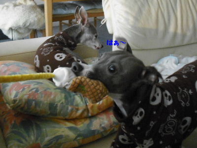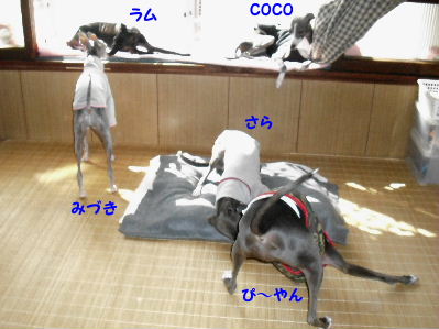 ★★★★★★★★★★★★★★★★★★★★★★★★★★★★★★★★★★★★★★★★★★★★★★★★ 今日はCOCO家が遊びに来てくれました♪奇特な事に一昨日作ったあの洋服を遊びに来がてら取りに来てくれたのです。勝手に作ったんだからお届けしなくちゃならないのにね~ありがたや~で、到着するなりみづきもさらも大歓迎♪心配してたあの黒いゴミも撒き散らさず、サイズもまあまあ合っていて、はづみづママはホッと胸をなでおろしたのであります。爆と共に次の野望はつづく・・・ 爆爆さすがヤングチーム(みづき以外)、壁にぶつかりながら遊び方も激しいですっ爆と思ったらアダルトチームのみづきも参戦そして大興奮したあげく、COCOラムママの腕に何度もしがみつき~~愛情のしるしなのでお許しを~~爆幸せの顔~と、あれ今日はアホ顔じゃない爆 多頭飼いの宿命自分のよりさらのガムが美味しいそうに見え、欲しがってるラムで、普通だったら絶対奪えないはずが、どんくさいさらは、噛み易くなった最後の一切れを、噛んでる最中にも関わらず、隙を狙ってたラムに奪われたのです。が、それにも気づかずキョロキョロしてたさら・・・どこまでどんくさいんじゃ~~~爆爆結局ラムが放り投げてたガムはみづきが奪い、食べ物に類稀なる才能?を発揮するみづきでした。爆今日はみづきじゃなくさらに懐くラムそして~COCO家より「はづきちゃんにも~」と頂いたカボチャのお菓子カボチャの大好きだったはづき、そのなにげない優しさにちょっぴりウルウルしたはづみづママでしたCOCO家の皆さ~ん、いっぱい遊んでくれてありがとう~♪いっぱい美味しいものありがとう~♪次回は手ぶらで~じゃんじゃん遊びに来てね~毎日でもいいよ爆 ★★★★★★★★★★★★★★★★★★★★★★★★★★★★★★★★★★★★★★★★★★★★★★★★ designed by hana