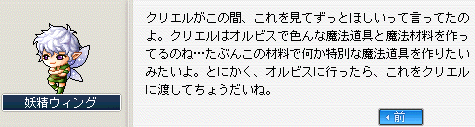 明日がエヴァンとデュアルブレイド実装でしたっけか。しばらく僕には関係ない話ですが名前くらいとっとこうかなー…もっとも今までつけようとした名前が使われていたことがないのですが。波状です。今日もSMでクエスト消化する仕事がはじまるお…NPCの妖精ウィングのクエストで気づいたのですがこっちがLv40クエスト(60%書が報酬のやつ)こっちがLv10クエスト(報酬がカス以下の以下の以下のやつ)口調が見る影もなく変わってんぞ。どっちにしたって萌えないゴミまぁ、これもネクソンクオリティか…それでもマンジさんが軟弱な口調になってたのはメチャ許せんよなァ。(「マヤと謎の薬」、「マンジと古びたグラディウス」の口調と砂漠に送ってくれるアレの口調を比べてみましょう)まずは世界旅行がルディだったのでおそらく最後の地球防衛スタート。地球防衛軍、ってメイプル世界は地球だったんでしょうか?英名は地球とか微塵も関係ないのですが。とりあえずクエスト報酬でイヤリングとか鉾10%とかゲット。ジェノは観月で勝てなかったので波状で全てジェノサイド。(いや駄洒落じゃなくてドロップなし。代わりにこんなんゲット。投げにまわすか、売るか…観月に戻り、海にお邪魔する。ポイズンパファーをふぐ刺しに、オットセイを肉に、ジュニアシールを人形に変えていきます。オットセイ肉50のクエストの報酬がするめであることを忘れていて泣いた。しかしオットセイ人形のクエスト終わっていなかったとは…放火魔にまわすつもりだったのに。最終目的地オルビスに到着。(画像はクエスト終わったけどSDTがもったいないのでルナフィクシを断ち切る観月)報酬は槍60%でした。狩ってみてわかりましたが、ソウルブレイドのおかげで雲の公園4が意外とうまい。撃つのにちょうどいい地形だし経験値も悪くないです。後半SDT、箱を集めるためだけにイエペペ突撃。今回は珍しくかみんさん(仮名)という同行者つき。おなじみの移動138砕骨装備の撃破効率最優先スタイルです。途中腹痛に襲われて40分くらいしか狩れませんでしたがドロップは上々。しかし腹痛に襲われるのは大体SDTだなー。元々胃腸が弱いといえどこれはおかしい。このことを雷破に話したら「祟られてる」と言われました。4年前、斬りが熱砂いってた時代からそうだからそうなのかもしれない。最後にソロビシャス、2回。2回でおよそ22,3分。ドロップは2回目のインフィニティ20のみ。ひどくね?今回のドロップinHero書はブレイド100%、防御鎧下60%、魔力杖60%inSM書はブレイド100%、攻撃槍60%、防御鎧上60%、魔力棒60%、攻撃鉾10%、攻撃手袋10%