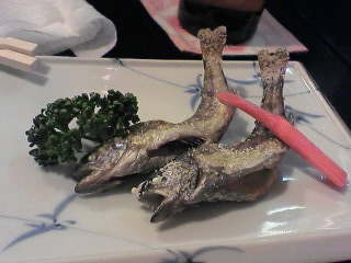 毎日寒いですね~~~木曜日のワシントンホテルの仕事で、演奏終了しても、パーティーが終わるまで片付けられず、40分くらいの空き時間さてさて、どうしたものかと思ったら、シルキーの厨房にいたHさんが屋台にやまべ料理のお店を出した事を思い出し行って来ました。Hさんのお料理はおいしいのはもちろん、彩りもとてもきれいです。よく厨房でつまみ食いをしてました一人であまり、お腹もすいていなかったので、塩焼きと梅茶漬けをたのみました。が...他にも、タチのポン酢、広尾産ししゃもの佃煮、一夜干、もちろん、やまべの天ぷら、タチ鍋...ああ~~~~~~~美味しいそうな物がいっぱいうまい!もちろんお酒もそして、出て来た塩焼きも絶品お茶漬けも、とっても美味しかったです。みなさん、屋台に行かれた時には、ぜひぜひ『綾乃』さんへどうぞHさんのおいしいお料理とちょっとがんこご主人との会話が楽しめます