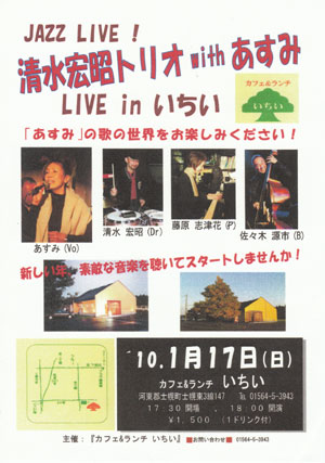 TOPページにもUPしていますが、今度の日曜日に士幌でライブがあります。トリオで4曲、残りはあすみさんの歌です。このトリオの曲もちょっと普段きけないものが入っているので、ぜひぜひ聞きにいらしてくださいね清水宏昭 トリオ with あすみ平成22年1月17日(日) 開場 17:30 開演 18:00場所 カフェ&ランチ 『いちい』チケット ¥1,500(1ドリンク付き)あすみ(Vo)清水宏昭(Dr)藤原志津花(P)佐々木源市(B)