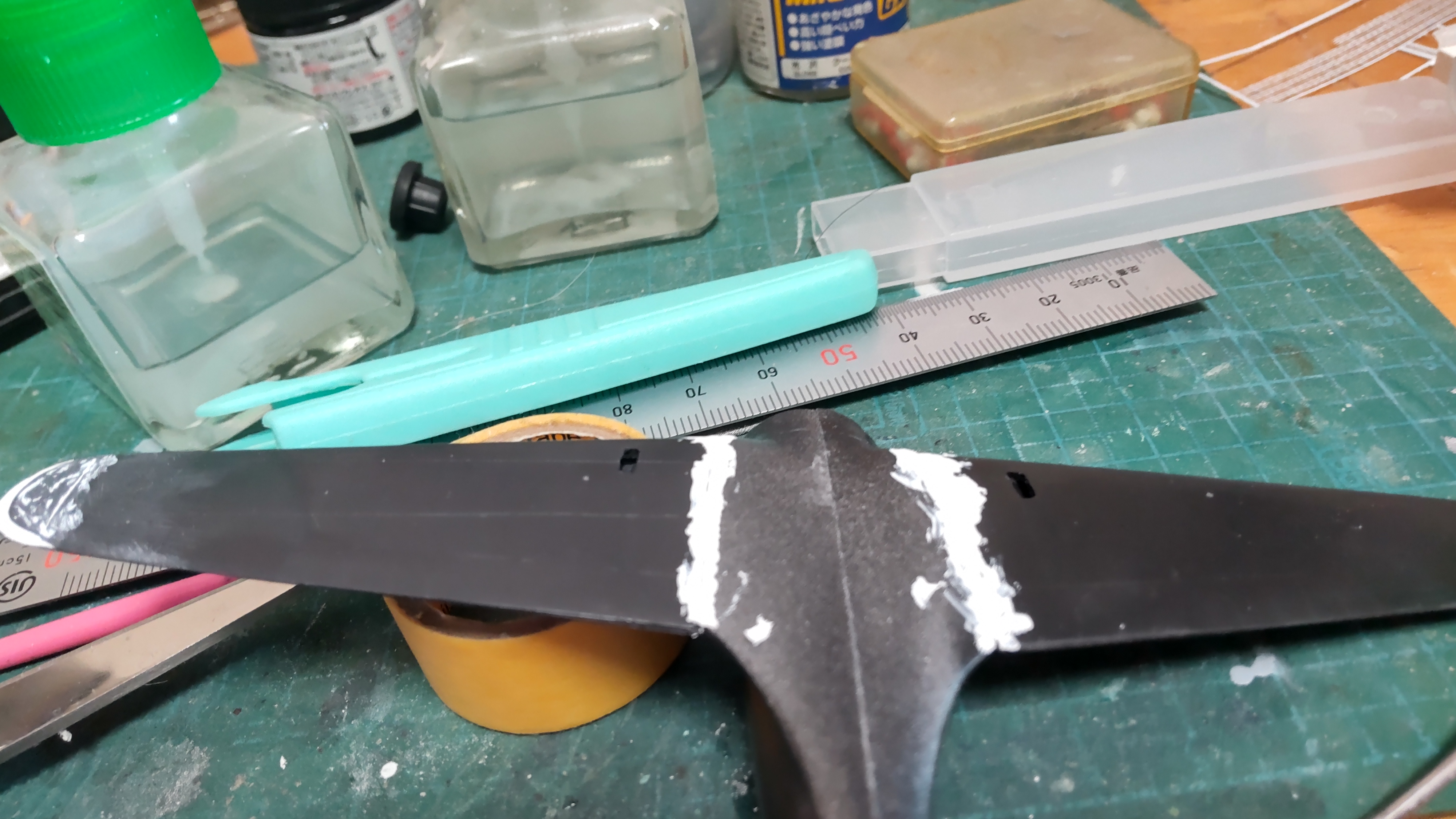 左右分割の機体を接着組立そして主翼を機体に差し込みました。隙間ができたのでパテ埋めごに成形処理しました。