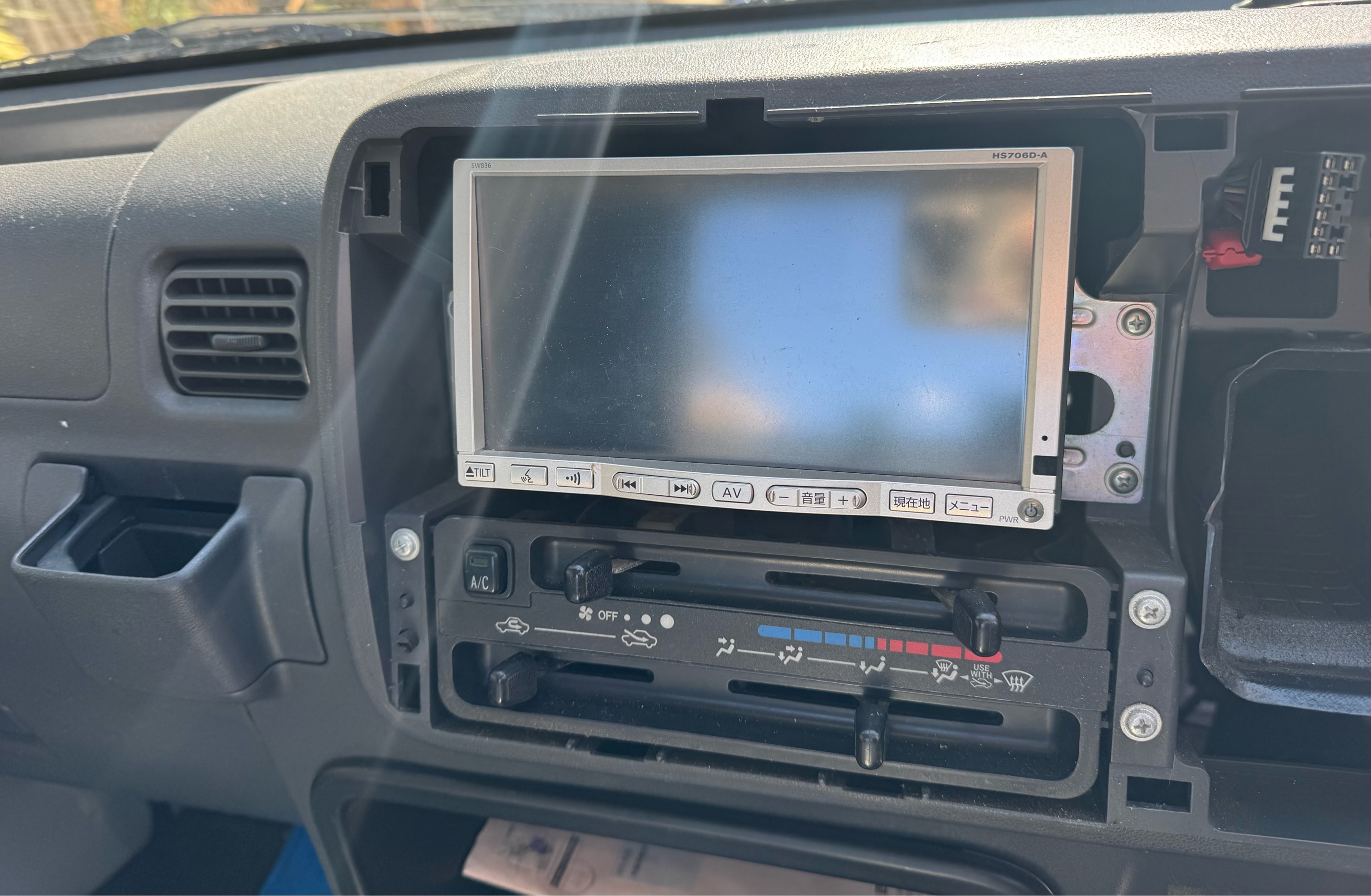 今日も仕事の合間に自分の作業です。最近、右スピーカーの音割れとナビ画面のクリア剥がれが気になっていたのでナビとスピーカーを交換します。ナビは日産 MG22S モコ純正オプションナビHS706D-Aでした。日産ですがスズキからのOEMなのでスズキカプラーですがトヨタ、ダイハツ変換カプラーを使い付けていました。スピーカーはカロッツェリアの10cm コアキシャルスピーカーでした。交換準備に入ります。取り付けするナビはケンウッドのMDV-X702です。使っていたナビの地デジアンテナなど全て外して次のナビの地デジアンテナなど配線を引き回します。軽トラの場合、Aピラーにカバーがないので配線の取り回しに悩みます。今まではゴムのモールを使っていました。このモールは中が空洞なので配線を中に入れて両面テープでピラー部分に貼っていましたが今回からは配線カバーとフレキシブルジョイントを買ってきました。オプションでも似たものがありますが金額が結構高いんです。配線カバーとフレキシブルジョイントを2個づつ購入して1300円くらいでした。実際に付けるとこんな感じでスッキリします。長さを合わせて切るのが面倒です。ナビの取り付けが完了して最後にスピーカーを交換して作業終了です。スピーカーはキッカーの10cmコアキシャルスピーカーDSC4です。