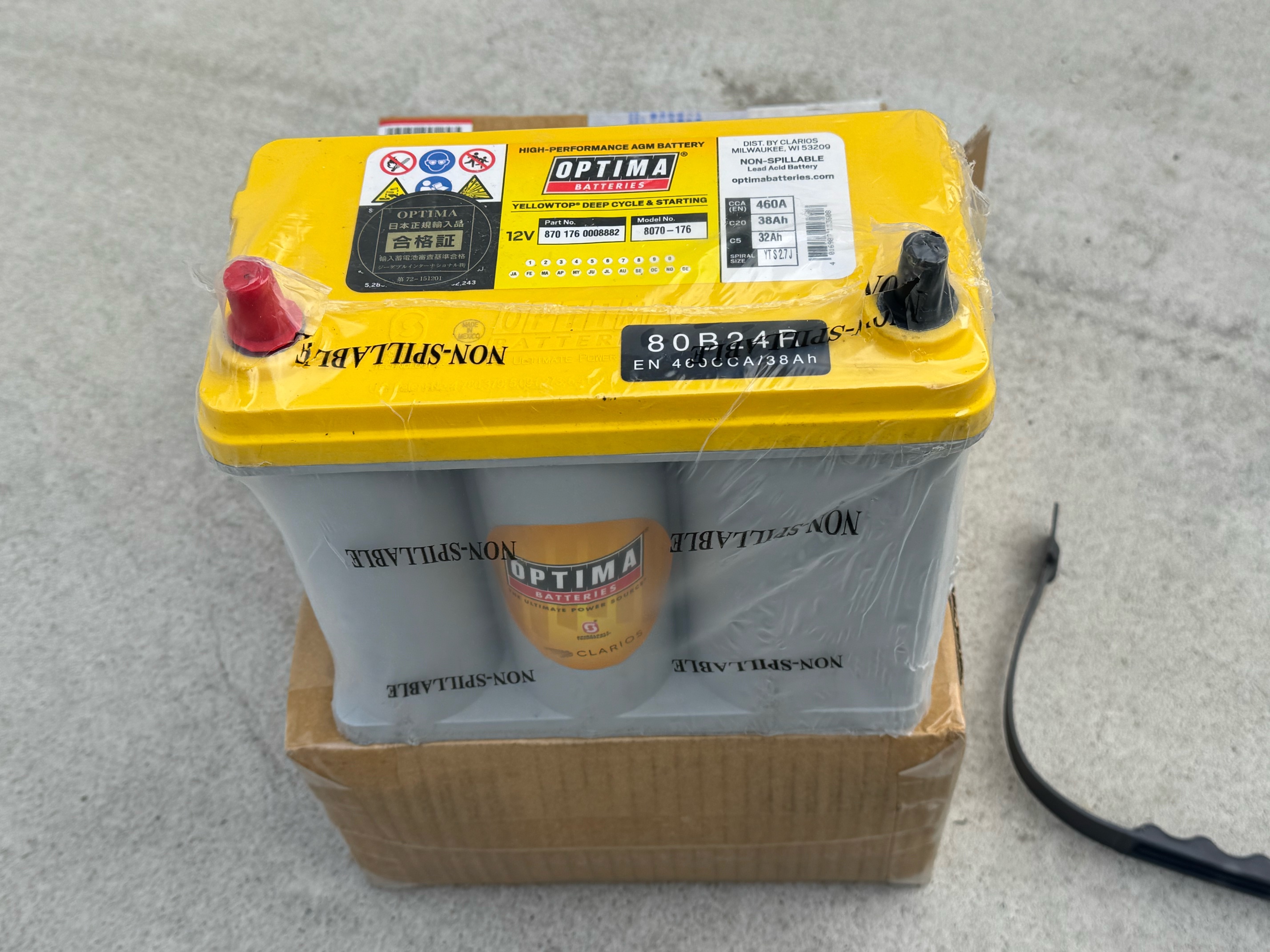 エブリィのバッテリーは新車装着のバッテリーが付いています。今年で4年落ちになるのでバッテリーを交換します。60B19Rもしくは60B20R辺りのバッテリーへ交換予定でしたがどうせならエブリィに付けられる最大バッテリーにしようと80B24Rを注文する間際で知り合いのオーディオ屋さんにオプティマバッテリーの金額を問い合わせたら倍以上金額が違いましたが注文し購入しました!!受け皿の加工が必要かな?っと思っていましたが無加工で入りました!!オプティマバッテリー【OPTIMA】イエロートップ YT-80B24R1 / N-55R互換 8070-176 ハイスペックモデル アイドリングストップ車・ハイブリット車・充電制御車対応【Rタイプ 端子JIS】46B24R/50B24R/55B24R/60B24R/65B24R/70B24R/75B24R互換