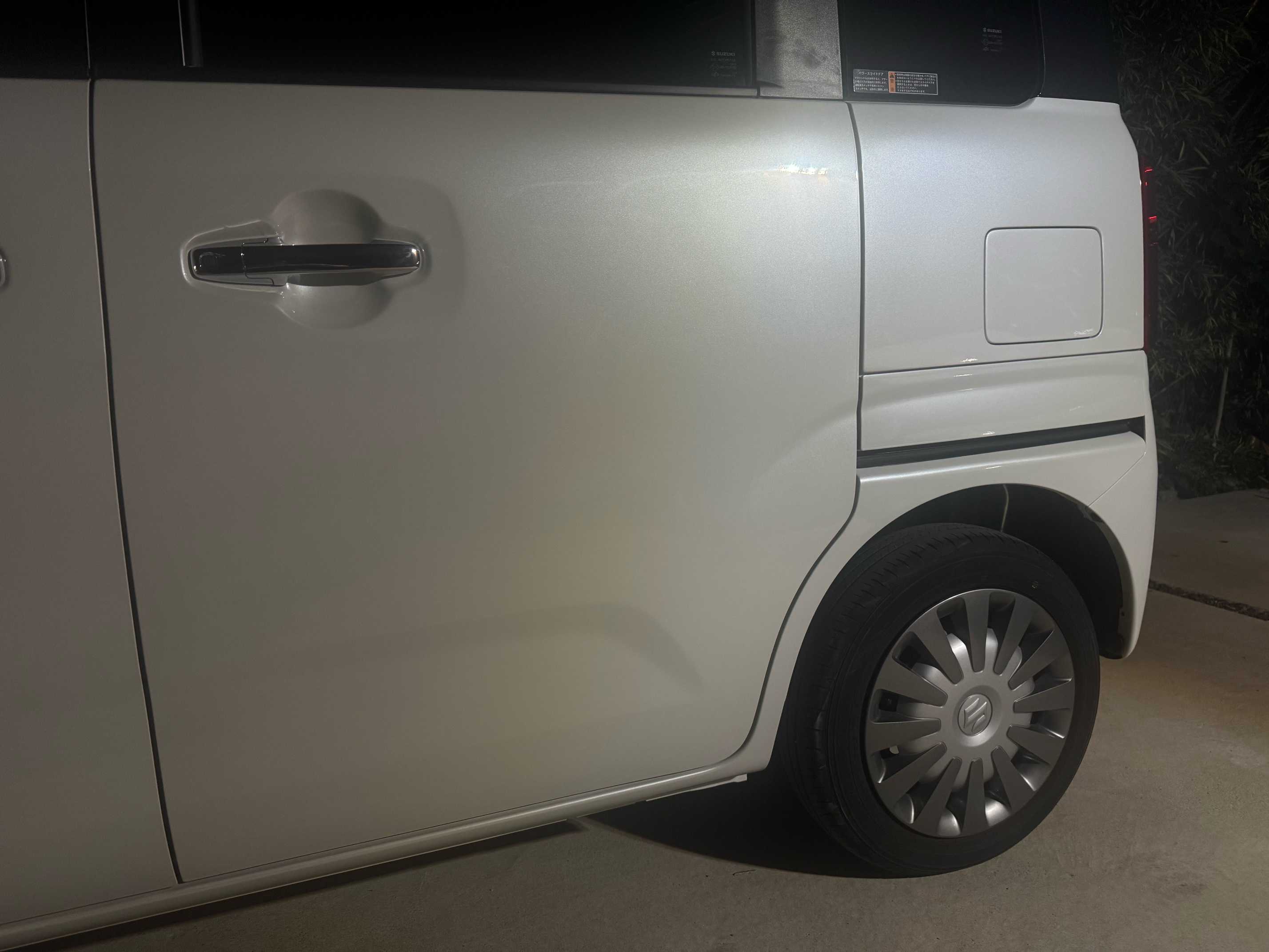 K様のワゴンRスマイル鈑金修理預かりです。R6年式9月登録車です。左スライドドアとリアフェンダーの鈑金修理になります。本来ならドア交換でフェンダーは鈑金となりますが予算的にドア、フェンダー共に鈑金修理となります。
