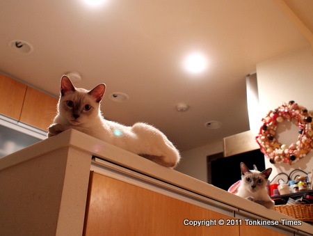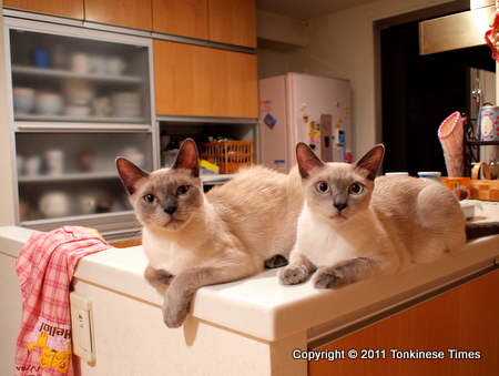 本日のキッチンカウンター族は・・・# 左から小太郎、最中もにゃさんとコタさんで~す!ようこそ!"なんちゃって大理石"のカウンターの上でふたり仲良く並んで涼んでいるみたいだけど、そんなにくっついちゃって暑くないんですか?っていうか、もにゃさん、目が大き過ぎです。by こごママにほんブログ村