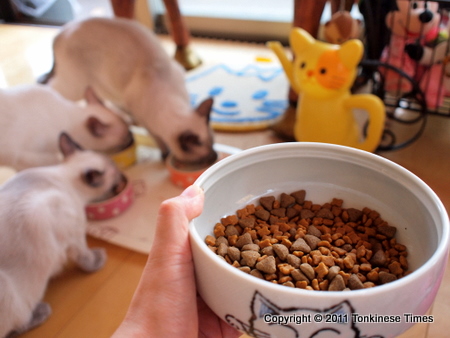 楽天ブログのメンテで昨日は発表出来ずじまい。実はブラザーズ、昨日あるものからの卒業でした。# もうこうなると誰が誰だか分らん・・・多分上から小太郎、大福、最中。カリカリご飯の話。生後十ヶ月になり、そろそろキトン用を卒業してもよい頃でしょう、ということで、アダルト用カリカリも混ぜての初ご飯でした。キトン用の粒の大きさに見慣れていたから、とても大きく見えますね~。ブラザーズはカリッカリッと軽やかな音を立てて、大きい粒の混じったカリカリを美味しそうに食べてくれました。さんにんの成長が嬉しい今日この頃。by こごママにほんブログ村