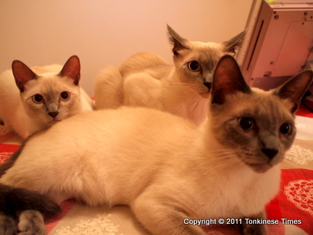 こんなとこにトンキの群れ。# 大福(左後ろ)、最中(右後ろ)、小太郎(手前)ここはどこかというと・・・こごママの自宅PCの隣なり。猫って群れるのねん。君たち、暑くないの?by 群れの頭にほんブログ村