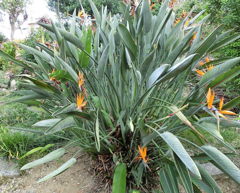 令和7年(2025年) 10月23日 木曜日きょうの旧暦 霜降 9月3日 大安/大潮 那覇市 日の出 6:33 日の入17:54熱 帯 花 木 ゴクラクチョウカ (こと極楽鳥花) 草本 常緑多年草 オオギバショウ科学名:Strelitzia Reginae Banks ex Ait.英名:Bird of Padadise flower別名:ストレチア、レギネ 原産地は南アフリカ。沖縄での開花時期:ほぼ周年。 草丈:100~200cm。葉はロジェット状(根出葉)に広がり、よく分枝する。葉は大形、単葉、革質、肉厚、長披針形、全縁。葉長は50~80cm。葉幅は10~20cm。 花茎の先が鳥の鋭いくちばし状(苞)、鶏冠のような上向き,放射線状に突出する特異な花姿。花被片は淡青色、花苞は鮮明なオレンジ色の萼(ガク)を有する。 花形とトロピカルの配色が熱帯の森に滞留する極楽鳥を連想させる。花径は15cm~25cm。 花持ち良く、2週間くらい鑑賞できる、高級切り花として流通する。葉も花材、観葉植物として利用される。 暑さに強く、寒さに弱い典型的な熱帯植物。ゴクラクチョウカ (こと極楽鳥花) 草姿草本 常緑多年草 オオギバショウ科学名:Strelitzia Reginae Banks ex Ait.英名:Bird of Padadise flower別名:ストレチアゴクラクチョウカ (こと極楽鳥花) 草姿草本 常緑多年草 オオギバショウ科学名:Strelitzia Reginae Banks ex Ait.英名:Bird of Padadise flower別名:ストレチアゴクラクチョウカ (こと極楽鳥花) 花一輪草本 常緑多年草 オオギバショウ科学名:Strelitzia Reginae Banks ex Ait.英名:Bird of Padadise flower別名:ストレチアゴクラクチョウカ (こと極楽鳥花) 花一輪草本 常緑多年草 オオギバショウ科学名:Strelitzia Reginae Banks ex Ait.英名:Bird of Padadise flower別名:ストレチア