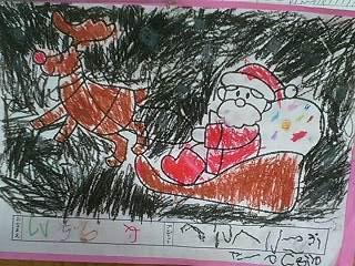昨年のクリスマスに保育園で長男イチ描いたサンタの絵・・・真っ黒に塗りつぶされていて見たときはびっくりしましたが・・・本人に聞くと・・・「サンタさんは夜来るからお空は真っ黒だよ!」一安心しました。クリスマス会に他の子の絵と並べて飾ってあったのでかなり目だっていてどきっとしましたね~。問題ないですよね???