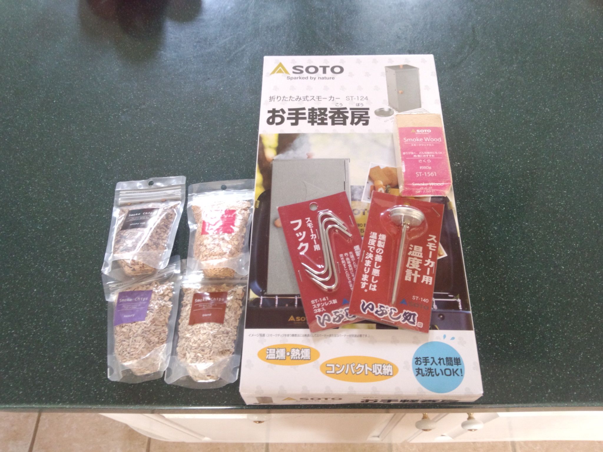 今日はやっとお買い物の日です。朝から業務スーパーへ行って「ファミリアチーズ」を3個購入。そこら辺のスーパーでは売ってないんですね。他にベーコンとか適当の食材を買ってから、帰りに魚屋さんによっていつものブリ1本とサバ2匹他適当に購入して一回帰りました。食材を冷蔵庫にしまってからまずは100均へ・・・細かい物を買って網もそこそこの物があったので購入。そのままホームセンターへ行って、ここでも網を購入。ついでにキャンプコーナーを見るとスモークウッドやチップが安かったので思わず購入。庭のビワの木をチェーンソーで切り刻んでチップにするぞ計画は今度やってみよう。家に帰ってきて早速ファミリアチーズをスモークします。1本のままでは長いので半分にして、更に縦に包丁を入れてスティック状にします。ヒッコリーのスモークウッドで90分ほど温燻します。出来上がったものを即食べても美味しいですが、ネットで検索するとそのまま熟成させた方が更に美味しいらしいので冷蔵庫で乾燥させます。サバを3枚にして1匹分はヅケにしてみりん干しを作ります。もう1匹は燻製にしようと思ったのですが、今回は奥さんが焼きサバにしたいとの事で断念。代わりに今日買ったサバに卵があったので、それを塩漬けにして洗って熱燻にしてみました。妙にねっとりしたベーコンの様なサバの卵の燻製になりました。うん、ご飯に合うねwwwサバの卵は初めて食べましたが、お腹が痛くならない事を祈ります・・・最後にいつものブリヅケを作って終了です。いや~充実した一日でした。明日も色々食材を買いに行きます。卵(お菓子用)太白胡麻油(シフォンケーキ用)豚バラブロック(燻製にして手作りベーコン)上記は基本ですが、他にもスモークチキンとかも作ってみたいので鶏ももにするかささみにするか・・・まあ明日決めましょう。明日も楽しそうだwww