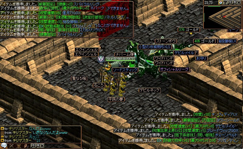 こんばんはー ねっと復活してまぁ地味に活動してます~生きてますよちゃんと。 負けててもうだめかーと思ったんだけど最後の最後に この僕 が相手WIZを釣ってる間に漆黒様が主力弓を沈めて勝利^^ BISが440になりました~あとシフも600に~転生できますけどもうスフィア買う予定もないのでこのままゆっくり育てていく感じですね SF出た!と思った瞬間死にました深い悲しみに包まれましたついでにUも載せといた!まじぱねえうほ川さん ぱきゅーんさんは高校いってきゃら崩壊したようですネーけつさんの耳にはいつも困ってます・・・ あそうそう久しぶりに自分の物再構成してきたんだ うへへめしうまじゃなくてごめんなさい こんなところでおしまい
