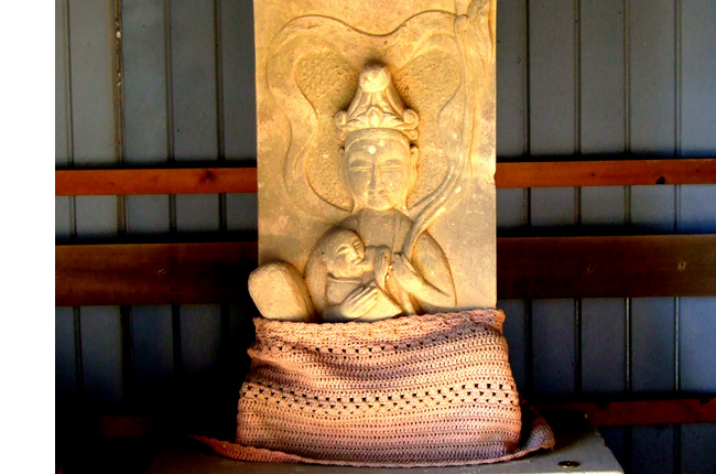地蔵菩薩とはサンスクリット語でクシティ・ガルバからきたもので、クシティは「大地」、ガルバは「胎内」「子宮」の意味であり、大地と内臓とを合わせて「地蔵」と言うことらしい。一般的には「子供の守り神」として信じられているが、石のお地蔵さんなどと呼ばれ、馴染み易い仏さんだ。近くの神社の境内に小さな祠があり、子供を抱いている菩薩像があった。いわゆる子安観音とか子安地蔵と呼ばれるものだ。観音も地蔵も菩薩の一種で、未だ悟りを開いてない修業中の仏様とのことだ。この神社の仏像は地蔵さんと言うより観音さんという風に思えたのだが、石の地蔵さんのイメージではないからだろう。 腰巻を着けた子安菩薩
