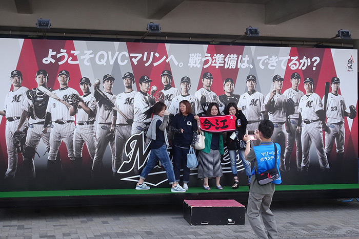ロッテの本拠地、QVCマリンスタジアムの正面にロッテ選手の看板があり、熱心なロッテファンと思しき女性たちがその前で記念写真を撮っていた。しかし、今江選手は今年から楽天だから当然バックにはいないので、たぶんロッテファンではなく今江ファンなのだろう。今日はロッテ対楽天の試合だが、女性の入場者が増えているようだ。私は観戦に来たわけではなく、単なる通りすがりの老カメラマンです。 ロッテチームと楽天ファン