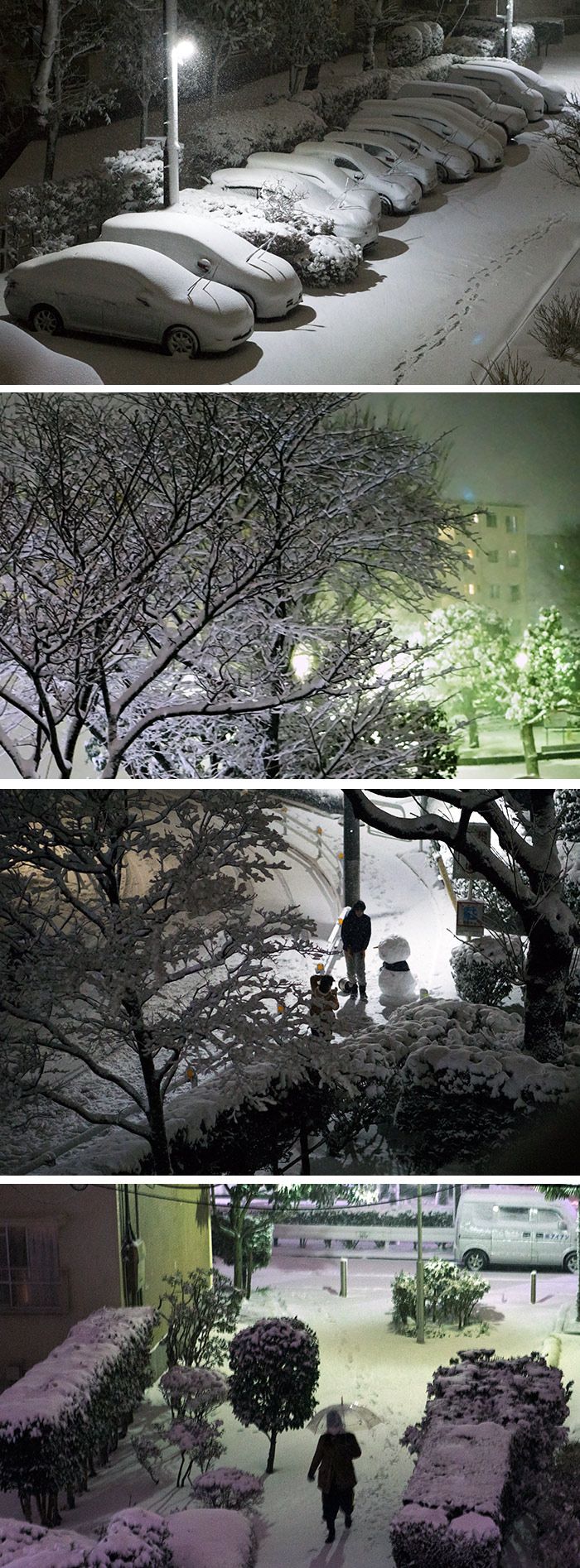 1月22日夜が更けてから雪が降り始めた。雪の夜に撮影に出る気力も体力もなく、よって家の中から撮る。9時50分、3階のわが家の裏窓から、また南側のベランダから、しんしんと降る雪景色を撮った。ワイパーを上に上げてなかったのはうちの車だけだった。桜の木の向こうにある公園とマンション棟がうっすらと見える真下の道路の歩道に雪だるまを造り楽しむ若者がいた。帰宅する人が車を降りて歩いてやってくる。