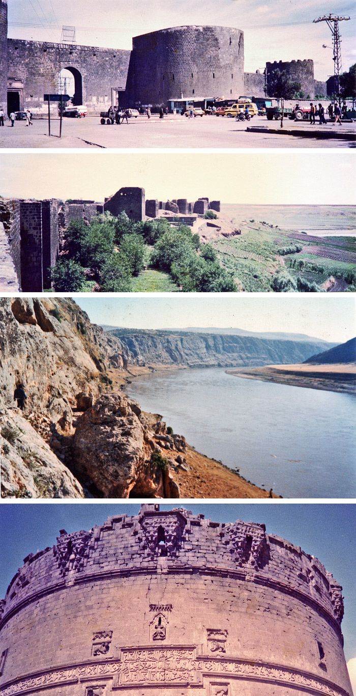 トルコ東部を流れるチグリス川を見下ろす丘の上にある都市デヤルバキルの歴史は古い。5000年前から既に都市国家として存在しており、アレキサンダー大王に征服されたのは更に3000年後となる。その歴史の長さは我々の想像を超えるものだ。壮大な赤黒い城壁で囲まれた現在の都市デヤルバキルは、強大なペルシャに対抗するために、紀元4世紀にローマ帝国によって建設され、その後ビザンチン時代にいく度かの改修が行われた。現在、完全な形で残っている世界最大の城壁都市と言われている。 クルデイスタン(トルコ、イラン、イラク、シリアに跨る領域)に住むクルド人は、このデヤルバキルの町を、クルド人の首都と見なして、民族主義者が潜みクルド独立への抵抗運動を続けている。 1983年にこの地を訪れたが、運転手に城郭の中には入らない方がいいと言われ、それに従い門前から引き返した。そして町の裏側に回り、町が繁栄した源たる大河チグリス川を望んだ。崖の中腹には昔人が穴居していたという穴が残っている。 1.ディヤルバクルを囲む城壁 2.町の裏側の城壁とチグリス川 3.人類の歴史と深く関わるチグリス川 4.ラテン語が刻まれている城壁塔