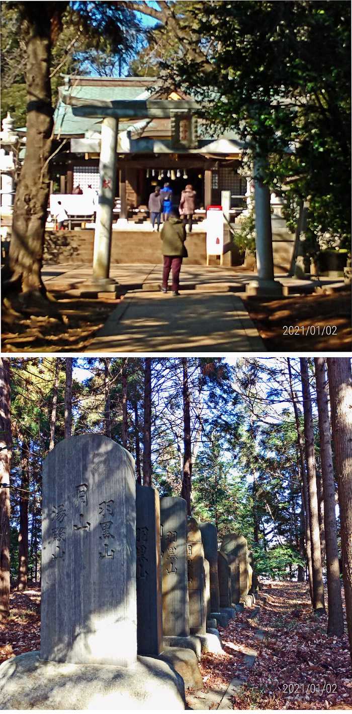 今年は客もなく、よって2日、コロナ封じを願い、毎年詣でている近くの三社神社に行ってきた。暮れに、身近な人の感染を聞いていたので、我が身も含めての神頼みだ。空気は冷たく、日陰には霜が降りており、手水の水も冷たいので省かせてもらう。ソーシャルディスタンスを保つためのテープが張ってあったが、並ぶほどの人は来てなかった。お御籤を引く。小吉にて「あせらず騒がずゆるゆる進めばよし」とあった。まさに私の心境だ。気になる病気は「平癒する、信神が大切」と、信心ではなく信神が大切とある。神様でも仏様でも信心でいいじゃないか、信仏とは言わないし、と思う。毎年境内ではお神酒を振舞っていたが、今年はそれがないのはコロナのせいだろう。お神酒で厄払いしてもいいじゃないか、とちょっぴりさみしく思う。また鈴も取り除かれていた。大勢が触れる物だからといろいろ気を遣っている。そんな中、お守りを授ける二人の神子さんが、マスクをしてないのが気になった。 神前と出羽三山参詣記念碑群