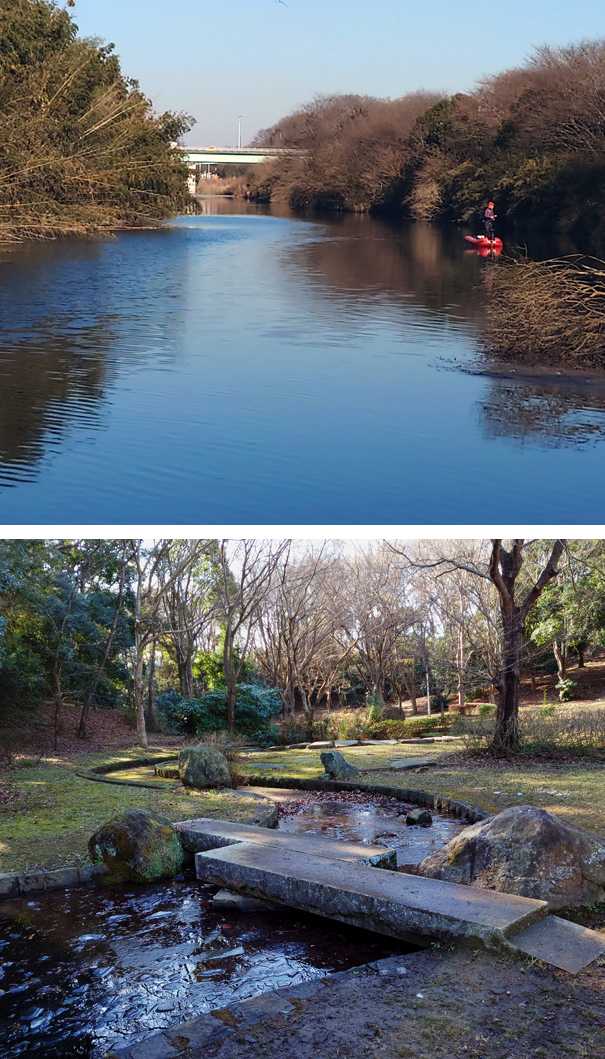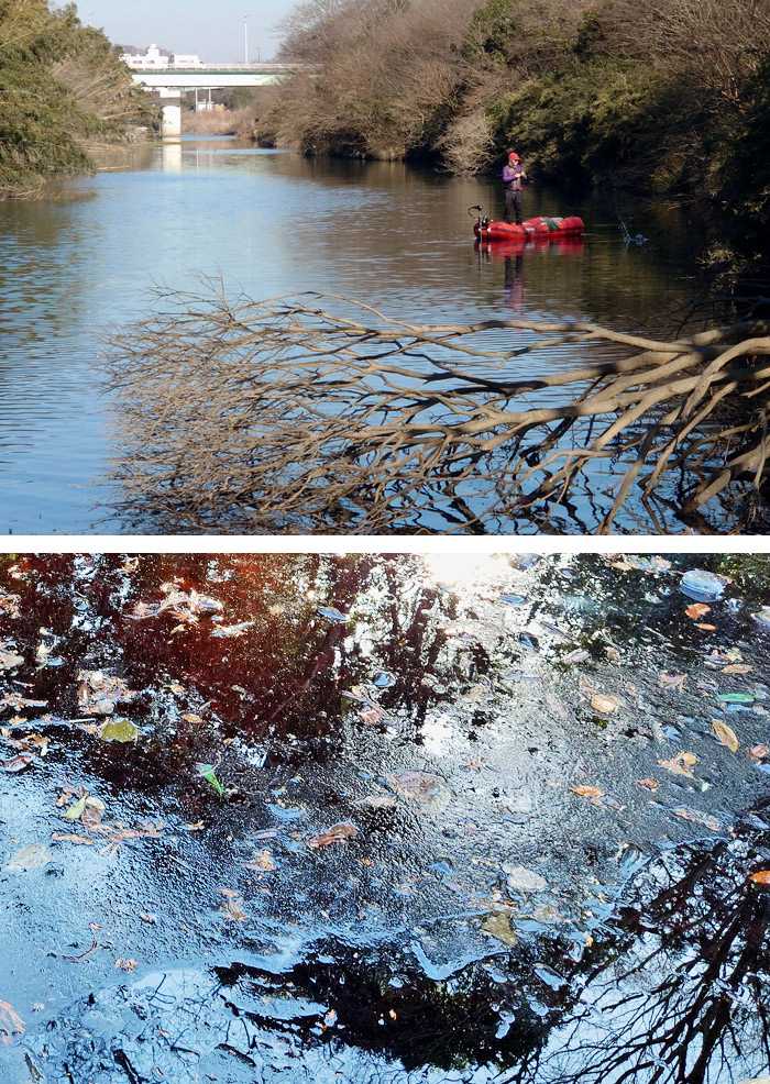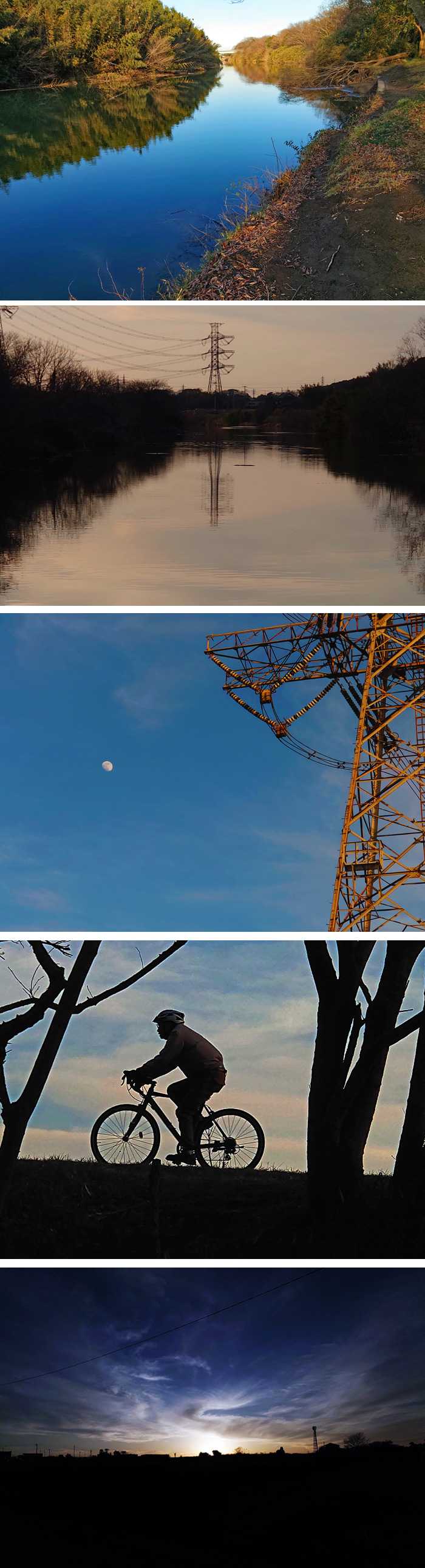 散歩道の風景:花見川上流、花見川下流、夕月、サイクリング、残照