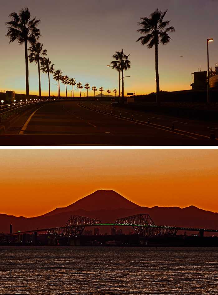 生きている証に賀状は送り続けたいと思う、と年末に出した年賀状に記したが、生きていてもペンもマウスも持てなくなくなる時がそのうちに来るだろうとも思っていた。 30日の朝日朝刊に今年の著名人の物故者が列記されていた。一部外国人も含めて80人ぐらいが略歴と共に記されていた。平均何歳で亡くなっているかと数え始めたが、バカくさくなり途中で止めてしまった。そんな平均値を出しても自分の目安になるわけでもないしと。 2022年の初頭から何か湿っぽい話になってしまったが、湿りついでに湿度計のことになる。12月に湿度計を買った。今冬は寒気厳しく乾燥激しいとのことで。以前から持っていたシチズンの温湿度計2台の湿度が同じ数値を示さない。そこで評判がよくあまり高くない温湿度計の2台セットを購入した。加湿器にも湿度計が付いている。しかし計5台の湿度計は全部ばらばらだ。5%なんてものではなく10%を超える誤差が多発する。一般用の湿度計なんていい加減なもので大まかな目安にしかならないようだ。 さて今年はどんな年になるだろうか、コロナも経済も対韓対中も揺れる綱を渡ることに変わりはなさそうだ。老人にはどんな影響があるのだろうか、まぁ悩んでもしようがないが、参院選ではもっと野党議員を増やしたいと思う。 元日、朝早く起きられないし、寒いし、車がないし、と初日の出撮りは諦めていたが、息子が夕方初落日を撮りに舞浜まで車で連れて行ってくれた。ディズニーランドの裏側の海岸通りになる。1枚目は南国の海岸通りっぽい風景を車中よりパチリ。正面に小さく富士山が見える。到着が遅れたので落日は撮れなかったが、2枚目は富士山と東京ゲートブリッジのコラボを撮ってきた。三脚を持参したがあまりに寒いので手持ちで数枚撮って早々に引き揚げてきた。 2022元日の夕景