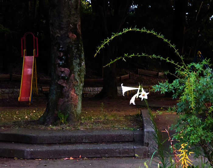暑さが引いてきた夕暮れ、いつもの順路を歩いていたら、薄暗くなった公園に白い花がほの白く光っていた。百合の上に被さる他の枝振りもいい。 ポケットからスマホを取り出し、光量を変えながら数枚シャッターを切った。気に入った一点をPhotoshopに取り入れ、これをスマホライカで撮ったらどんな写真になったのだろう、と思いながら補正しブログ用にサイズを落としていった。 未だぐずぐずと決断し切れず、指を咥えてXaomi14Ultraの値下がりを待っている。