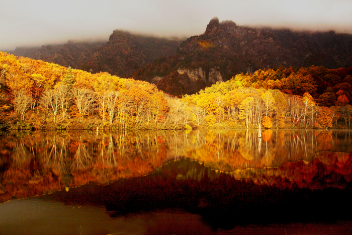 Microsoft beingの商品広告で、新潟県津南町の「かたくりの宿」が紹介されていた。懐かしい宿が目に入ったので昔のことに思いを馳せた。ところで最近のウエブページはほんとに広告が多くなったものだ。 2009年秋に新潟県の清津峡から秋山郷を通り長野県の野沢を抜け、最後に戸隠の鏡池に映る秋色の撮影、と紅葉を満喫しながらのドライヴと撮影を楽しんだ。 この旅の最初の宿が「かたくりの宿」だった。廃校になった小学校を温泉宿に衣替えしたもので、珍しさと安さに惹かれて予約していた。日本で1,2を争う豪雪地帯のこと、元校庭に差してある竹尺の遥か上に過去の積雪量を示す赤リボンが結んであり、4mぐらいとのことだった。 客は私1人だったからか、若い女性二人で、接客から食事まで切り盛りしていた。夜半の静寂の中、学校の怪談話を思い出し、深夜の共同トイレはちょっと気味が悪かった。 当時ビール1本飲んで1万円弱だったが、最近紹介されていた料金は1.25万円と、最近の観光地での値上がりとはかけ離れた僻地の宿を偲んだ。 朝日を受け輝く黄葉が水面に映える、後ろが戸隠山
