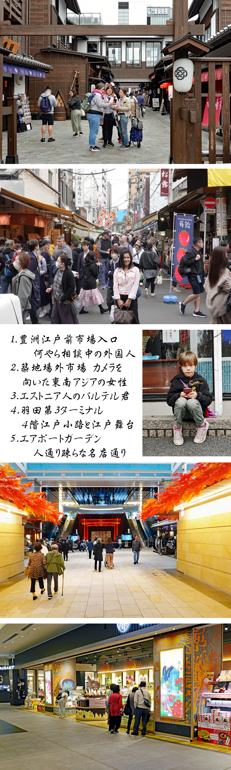 今年のバスツアーは、東京の新名所に行くことになった。新名所とは豊洲卸売市場であり、併設された先客万来で江戸前を味わい土産を買う、予定だったが。 先客万来とは豊洲場外江戸前市場と温泉宿泊設備の万葉俱楽部を擁する複合施設のことで、江戸前市場は築地の場外市場を受け継ぎ発展させたものとかで、江戸風の施設に飲食や雑貨の老舗が軒を連ねている。万葉倶楽部は箱根の湯を日々運び込んでいるそうだ。多分に外国人観光客を目当てとした観光施設という感じがする。事実外国人が多い。 江戸前市場は諸品高騰にて手が出ない。つまみ食いも後に控える「すしざんまい」での寿司コースを考えるとあまり手が出ない。結局場外市場をさっさと廻り、魚市場へと向かった。先客万来と卸市場は連絡道でつながり10分ほど歩き、市場見学通路に至る。しかし、魚市場は既に競り市もマグロ解体ショーも終わって、後片付けでターレが走り回っているだけだった。 2時間後バスで築地へ向かう。運河一つ隔てた向かい側なのであっと言う間に到着。昼食前に、築地場外市場に向かう。ちょうど昼飯時のこともあり、外国人が豊洲よりも多い。昔ながらの店が連なる通りをいろいろな外国語が飛び交い、賑わっている。 男の子が道端に座ってスマホでゲームをしていたので、傍らにいた祖母らしき女性に許可をもらい少年にカメラを向ける。祖母らしき女性に少年の名前を訊ねたが発音が理解できない。彼らはエストニア人でエストニア語での発音は難しいからとと英語で言いながら、自分のスマホで日本語(ひらがな)に直して「ぱるてる」君だと教えてくれた。バルト3国はロシア語に近いらしいが、エストニア人と会話したのは初めてだった。彼ら外国人はこのようにスマホで日本語を自国語に訳しながら旅しているのだなと思った。 昼食は最近名が売れている「すじざんまい」の新館でツアー客用のコース料理で握りを頂く。ツアー料金の中に含まれているとは言え、コース料理とはこんなものかと思える程度だった。過去のツアーでも食事にはいつも不満が残った。今回のようなツアーでは豊洲でも築地でも飲食店が多数あるので、自分で好きな食事をしたほうがいいように思ったが老人が多いから問題があるかな。 昼食後、羽田空港へ向かう。最初に予定していたJALの整備工場とミュージアムの見学は1か月前の抽選会で外れてしまっていた。人気コースなのだ。 代わりに国際線第3ターミナルへ向かう。折から雨が降り出し駐車場から建物まで歩いて少し濡れる。2階の到着ロビー、3階の出発ロビー、4階の江戸小路を抜けて5階までエスカレーターで、お上りさんよろしく団体で昇って行く。5階の展望デッキで飛行機の離着陸をバックに集合写真を撮る予定が、雨のために軒下で、撮影条件の難しい撮影となった。後にアルバムを作成し全員に配る予定であり、集合写真は表紙を飾る重要な写真だが、不満の残る画像となった。 再び4階に降り、昨年開業した「エアポートガーデン」へと向かう。日本全国の逸品や名産品を集めた専門店と日本各地の名店グルメが80店ほどが連なっている。ここも値段が高いので我々は見るだけのウインドウショッピングだ。日本人も外国人も客が少なく、これでは各店は立ち行かないのではと心配になるほどだ。そしてバスは帰途に就いた。幸い行きも帰りも渋滞に巻き込まれることもなくすいすいと帰宅できた。私のお土産は結局、豊洲での丸武の卵焼きと羽田エアポートガーデンでの追分団子とローソンで夕飯を購入しただけだった。 豊洲・築地・羽田