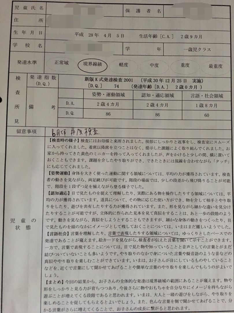 長男のときも発達検査を受けたのですが検査内容はおそらく同じですが長男のときにはなかった結果の紙がもらえました(長男のときは口頭説明のみでした)発達検査に迷われているママさんがいらっしゃったら受けてみるのをお勧めします私が住んでる市の場合は予約すると無料で受けられます市町村によっては費用がかかったりするのかもしれませんが何かしら子育て支援をしてるところが紹介なり、何なりサポートしてくれるはずです(これだけ子供産め×2言ってるのにサポートがないとか考えられん)今は私が小さいころに比べたらずっとずっと発達障害に対しても認知度が高いし、専門の先生も増えているしうちの市なんて予約が混み合ってるぐらいなので沢山のお子さんを検査されているしでもしも発達障害じゃなかったとしても専門の先生に直接育児のアドバイスをもらえるのはいい機会になるしそして何より、発達障害だとわかれば一時はショックではありますができないことは障害のせいだとわかれば、むやみに叱ったりせず子供にしてやれるサポートを考えるので気持ちが落ち着く気がしますうちの次男は検査の結果まだグレーですがあせらず声かけをして、早く言葉が増えるのを願うばかり。。。日記・雑談ランキングにほんブログ村
