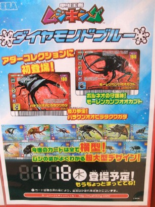 近所の店舗で今週も平日ムシ大会があるのですが,この日息子が「今日も行ったらいい?」と聞くので(ちょっと腰が引けてますね ^^;),「第2週の火曜なんだし,行って来い」とハッパかけました。第2週の火曜日・・・10月から3か月連続でこの店舗の平日大会で優勝してますし,なんかジンクスっぽくなってますから,行かせないわけにいきませんよね(^^;)。大会には24人くらい集まっていたようですが,うまく出場できる8人に選ばれたようです。まずもって抽選に当たらなければジンクスも何もありませんから,まずは第1関門突破です。試合のほうは今日は普段私に言われていることの実践を心がけたようです。わざとそうしているのか?と思わせるくらい必殺くらいまくりの最近の息子でしたが,逆に必殺がきまりまくりの戦いぶりだった模様。1回戦では負け必殺がきまって勝利したあと,準決勝では勝ちムシで必殺2発勝利。そして決勝では,うまい駆け引きから,締めも必殺をきめて,なんと優勝したそうです(^^)。いやはや,これで4ヶ月連続で第2週の火曜に優勝したことになります。来月も勝ってしまうんでしょうか(^^;)。さて,大会も終わって,仕事帰りの私も息子たちに合流。息子はワンタメもやらずに太鼓なんかで遊びまくってましたが,仲良しの子が100円ワンタメに入れて出てきたのは,息子が唯一持っていなかったシークレットでした。「やればよかった・・・」とちょっとガックリの息子。それじゃあ,とその店舗から車で15分ほどのジャスコで,ワンタメをやらせたら,300円でシークレットが。さすがに持っていなかったシークレットではなかったのですが,慌てて先ほどの店舗に逆戻り。さっきの仲良しの子が出したシークレットと,めでたく交換が成立し,これでワンタメのカードが全部揃った模様です。あとは大会を待つだけですね(笑)。ムシで優勝,ワンタメコンプと気分もいいので,正月も行った家から近いスパに行きました(やっぱりね,と笑ってるママさん約1名? 笑)。サウナに入って,気持ちよく汗を流しました。この日はついにムシでも今年初優勝をきめ,たま→恐竜→ムシと,理想的な順番(^^;)で勝つことができました。このあともコンスタントに勝って欲しいものです。・・・ああ,私の今年初優勝はいつになるんだか・・・(笑)