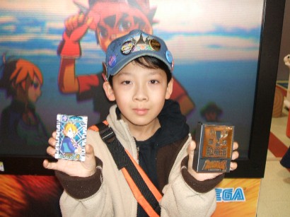 次世代ワールドホビーフェアの初日,羽田からリムジンバスに乗り幕張へ。到着したのは10時半くらいでしたが,会場入口のはるか遠くから(道路一本向こうの,そのまた更にはるか向こう)入場のための行列ができていて,会場に入るまでに,30分以上グルグルと外を歩いてました。ようやく入場して,まず向かったのはやはり「ちゃおカップ」会場。次の日の下見です。ここでどうやって参加者に筐体が割り振られるのか,補欠抽選はどういう感じなのか,そしてなんといっても競技は何なのかを偵察(笑)。この日は「かけっこ」「たまのり」という,「すぴーど」オンリーで行われていました。当然「まきこ」オンリーか?と思いきや,けっこう「スーパーまめっち」が多く,また自分の好きなごっちということで能力的には?だけども,お気に入りのごっちを使っている子もいました。おそらく次の日もこの競技だろうと思い,いろいろチェックしてましたが,皆やはり「たまのり」で苦戦しているなという印象。練習の差が,やはり「たまのり」に出ているという感じで,この部分だけは「たまのり」得意の息子に有利かなと思っていました。この午前2回目の大会では,このブログでもうちが大変お世話になっているほのほのさんの娘さんも参戦していて,当初うちの到着が間に合わないと思っていたのですが,ちゃんと見ることができ,見事MVPを取る瞬間に立ち会うことが出来ました。おめでとうございました(^^)。さて,私がそんな偵察をしている間,息子は「恐竜キング」の無料プレイをずーっとやってました。というのも,この日は「第6紀」先行稼働ということで,一足早く新バージョンを何度もプレイ。さすがに1回やるのに30分は並ぶ必要があったのですが,息子はスティラコを出したくて,イキイキとして並んでました。息子のとなりでどこかの子がパラサウロを出したようなので,レアはそのまま入っていたようです。金はさすがに引けませんでしたが,息子が大喜びだったのは,新チョキ超ワザの「サンダーバズーガ」を引いたからです。ワザとしては,「ムシのダンガン」と一緒です。回転しながら相手に体当たりです。また新ワザとして「百烈ビンタ」(パー)というワザも引きました。これは恐竜がビンタするんですが,そのビンタにあわせてボタンをタイミングよく押せば,相手の体力をちょっと上乗せして削ることができます。ビンタは,「バン,バンバンバン,バババババババババン!」って感じでビンタします(^^;)。また21日には,他の子が「パウパウパワー」(グー)というカードを引きましたが,これは最後に負けたときの相手の一撃を,一回だけ無効化するワザだそうです。でもショックや,ふうじが使えなくなるので,実戦向きなのかどうかは・・・。そして「エレメンタルパワー」(チョキ)という,超ワザの威力を増すカードが出ます。これだと属性負けして威力が落ちた分を少し補えるようですね。そして注目の草の特殊超ワザは,名前は息子が忘れましたが,「草の力で体力が回復するぞ」というカードが出るようです(やはり薬草のイメージでしたね)。このカードはグーなのですが,これで「かいふく」と「はんげきかいふく」と一緒に使うことができ,必殺を食らった後に特殊超ワザが発動したら,体力は「元通り」くらいになるのかも知れませんね。そんなこんなで息子が恐竜キングに並んでいる間,暇な私はこんな写真を・・・。単なるカメラ小僧になってました(笑)。でもちゃんと次の日にむけてこんな写真も・・・。ムシブースでは,いろんな方にお会いしました。お話をした方,お見かけするだけだった方,いろいろでしたが,短い会話でも,楽しいひとときでした。会場から出るにも30分以上かかってました。ホテルにもどってパパリッキーさんや,IMTの会長さんに今日の雰囲気を報告。本番の健闘を誓い合いました。パパリッキーさんには,東京での食事で誘われましたが,ちょっと遠いため(うちは幕張宿泊)残念ながら断念。息子と2人で海浜幕張駅のそばのセガで遊んでました。ちょっとDBZ2に手をつけたら止まらなくなって(^^;),激2枚やら,爆,そしてシークレットを出したようです。その途中,一本の電話が・・・。ジョイポの道場に参加していたIMTの副会長さんからでしたが,話を聞くとなんと同じホテルに泊まるということで,合流し,一緒に飲むことができました。息子も大喜びでした。1次会を終えて,ホテルに行き,一緒にホテルの露天風呂に入ったり,部屋で一緒に2次会をしたりと,楽しい時間を過ごすことができました。次の日の大一番にむけて,いい感じにリラックスできました。そして,ついに本番の日を迎えました。