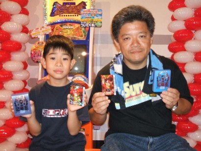 テレビで恒例の24時間テレビをやっていました。「愛は地球を救う」ですね。さて,この日,朝から息子の調子がいまいちでした。昨晩騒ぎすぎてその反動が来たか,夏休みの疲れが最終日に来てドッと出たか,ボーッとしてます。11時,恐竜大会がありました。小学館予選の裏ではありましたが,故あって小学館をパスするうちはこちらに参加。嫁さんの初戦は一手のズレが命取りになって敗退。息子,調子が悪い中,1回戦はそっこうスピノで勝利。2回戦は先に1頭落とすものの,2頭目で逆転して準決勝へ。私ですが,初戦はそっこうパタゴがいい感じでショック連発させて勝利。2回戦,2頭目同士になったところでそっこうアロの必殺2連発で勝利。準決勝は息子との対戦。ここは私が貫録勝ち(^^;)。決勝。ちょっとデスを使ってみたくなり,そっこうタルボにつけてみました。一発負けるも発動せず,結局ボルケーノがいい感じで1頭目を取ります。相手2頭目にすぐにやられこちらも2頭目へ。こちらそっこうパタゴ。相手スピノ。一手取られますが,その後はパタゴがショックとバクダンで攻め込みます。相手にパウパウが点灯しましたが,最後はあいこ3発で相手の体力はなくなりました。ということで,この大会,私が優勝となりました(^^)。13時は店を変えて恐竜大会。筐体から出てきたカードを両者使うというルールです。抽選の結果,私はハズレで,嫁さんと息子が当選しましたが,なんとこれが初戦で母子対決。息子も何やってるんだか,嫁さんが勝利。で,その2回戦,嫁さんの対戦のとき,さあこのカードを使いましょうって出てきたのが・・・パキケファロ!さあどうしたものか・・・ボタンを押すなって言うべきか悩みましたが(^^;),まあ普通にやれと・・・。相手の子供は「負けたら勝ちルール用デッキ」で来てましたが,そんなこと嫁さんに分かるはずもなく,普通にやっていて・・・勝っちゃいました(泣)。そして続く準決勝では逆転負けするし,どっと疲れが・・・(笑)。14時からはドラクエがありました。また今日も40人近くの子供が集まりました。ですが,なんと今日は息子の名前が呼ばれ,参加賞カードがもらえることに(嬉)。ドラクエの時間はゆっくり「頭文字」をやろうと思ってたのに誤算(笑)。その「頭文字」は,A1昇格戦の前で足踏みです。初戦はバギクロスで勝ったものの,2回戦では怒りの魔人を使っていた相手がバギクロス用3体に変更。こっちはマジックバリア,相手はぱふぱふということで,一発は強烈でしたが,あとはお互いバギクロスを出してもそんなにダメージを与えられない展開に。こうなると,どっちが先に攻撃できるかという運もあって,最後は先に攻め込まれた息子が負けてしまいました。まあ,参加賞狙いだから仕方ないや,と(^^;)。その参加賞もあと1枚になりましたが,次に参加できるのはいつのことやら・・・。15時はムシタッグマッチ子供戦。息子は初戦,あいこでも負けるところでタッチしますが,有利になったところで,今度は相手のタッチを許す,いつものヌルイ展開。で,最後はあいこの連続になり敗退。ホント息子にタッグマッチは合いませんね。1匹目で相手の出方を窺い,2匹目で勝負するという仕方が身に染み付いているので,1匹倒れたら終わりなんていうルールにいまだ対応できないんですね。16時からはランダムペア3匹戦。ペアのどちらかが1匹,もう一方が2匹を担当します。ここは息子が外れました。嫁さんのペア,相方が1匹倒すも,ちょっと負け手を出せないでいたことからすぐにやられ,嫁さんも最後の力3発をくらい,相手の3匹目を出させることなく敗退。私のペア,未就学のケント君(4歳くらいかな?)と組みました。さっきのタッグマッチで準優勝ですから,私,心強いです(^^)。初戦,ケント君頑張るも,先に倒れ,そのあと私が2匹使ってなんとか2.4匹くらい倒して勝利。2回戦は,なんとケント君が1匹で相手3匹を倒してくれました!準決勝,ケント君好調で相手2匹を倒してくれます。私登場ですが,ちょっと手を試しているうちにこちらも3匹目を出すことになりましたが,2匹目でいろいろやったことが功を奏したか,3匹目を出したところで一手で勝つことができました。決勝,ケント君,いい感じで相手を1.5匹倒してくれました。私の出番。相手2匹目を倒し,迎えた3匹目をレッドにして,こちらも3匹目をスキャン。アクティオンにマックス装備。全点灯・・・。あいこでも勝つ状況に追い詰めたところで,ちょっと邪な考えが走り,負け必殺で決めてやろうと思ったら最後付きの必殺被弾(あれほど負け手で勝ちに行ったらダメって言ってるのに ^^;)。一気に最後の一手勝負になりましたが,最後はあいこ・・・。ということで!ケント君と私のペア,優勝することができました(^^)。ケント君の頑張りに尽きますが,この「新旧ペア」,年の差なんと40歳!(笑)。こういうペアで優勝しちゃうんだから,ペア戦って楽しいですよね。この優勝で,私75勝目になりました。あと25勝ですね(^^)。さてトリオもそうですが,ペアの楽しさはお互いが相方の調子をカバ