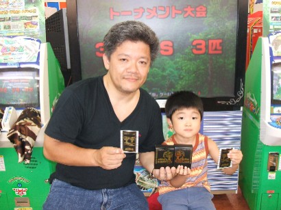 今夜は私の祖母の葬式でした。享年96歳。大往生ですね。その前に…午前,小学館の予選がありましたが,ムシの神様は絶対息子を通過させてくれないようです。代表決定戦である準決勝で負けました。勝つチャンスをことごとくつぶし,自滅しました。簡単に負け手出されては負け,簡単に負け手出し手は必殺を食らう・・・。息子らしいといえば息子らしい負け方ですが(笑)そのあと「大怪獣」のヨーカドーカップがありましたが、参加は8人で、息子は一度も相手にアタックチャンスを与えないまま優勝することができました(嬉)ダメージは準決勝で相手のコンボ攻撃を受けただけでした。息子は大怪獣で初優勝です。そして、葬式までちょっと時間があったので,近くのゲーセンに、イニでもしようかと行きましたが,そこで恐竜大会があるというので空きもあったことから急遽参戦。パウパウ禁止2000禁止ということで,初戦は相手にデス発動するもパタゴがうまくショックとバクダンを使って,準決勝はアロが3発で,決勝はタルボが相手のデスをかいくぐって勝ち,優勝できました。午後は息子にとっての曾祖母があの世から応援してくれたのでしょう(^^;)。