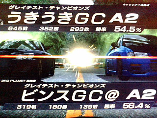 無事祖母の告別式を終え,お盆ですから,告別式でもらった生花を抱えて,その足で我が家の墓参りに。炎天下ということで,どの墓の前のローソクもぐんにゃり曲がってました(笑)。一旦家に帰り,ウズウズした気持ちを抑えきれず,再び外出・・・「頭文字」A1スタートでしたが,いきなりの3連敗でA2降格となりました。まあ,また頑張ればいいやと気持ちを切り替え,次の一戦は勝利。そして,次勝てば昇格戦だという時,彼はやってきました・・・。同じチームのビンスさんとマッチングです(^^)。でも,あれ?チーム名がないぞ?ということで,「サブカ」でプレイ中なんだなと。こちらはどのコースにしようかと思いましたが,少しでも長く走っていられる「秋名」を選択しましたが,例によって例のごとくこの写真を撮っていて,スタートをちょっと失敗しました(^^;)。それでも楽しく走っていられるな~と思っていたら,けっこうブロックもされる・・・?途中離すも猛追されます。それでも「同じチームだし,きっと・・・」なんて考えていましたら,最終コーナーにさしかかり,リードしていた私は,特にブロックの必要もないだろうと,普通にスーッとコーナーに進入したら,その脇をスルリと抜けたカプチ・・・。え?え?そんな?ははーん,カプチはゴール前で止まって私を・・・って,そのままカプチ,フィニッシュ!負けちゃいました(半べそ)。ビンスさん,またチャレンジしますので,よろしくお願いします(^^)。ゲージが下がり,昇格戦はさらに遠く・・・。このあと10数戦走るも,どうも調子が出ず,昇格戦にとどかないまま,他の客がうしろに張り付きだしたので退散。ビンスさんとの対戦・・・盆から水がこぼれたよなあ・・・盆に帰らない・・・フクチー盆に帰らず,ってフクチーも忙しいから・・・じゃなかった!(笑)「覆水盆に帰らず」,っていうんだよなあこれ・・・なんて思いながら退店。車を走らせながら,ボーっと考えていると,なぜか車はいつもの近所の店に到着していました(^^;)。再び座るイニD・・・。2連勝して,ようやく「A1昇格戦」になりました。来い!格下!(笑)来たのは格上でしたが(^^;),妙義下りで勝ち,なんとかA1再昇格となりました!(^^)覆水が盆に帰った!(爆)A2で少し足踏みをしたことで,ポイントはスタートしたときより,若干増えて終わりました。またSに向けて再チャレンジです。