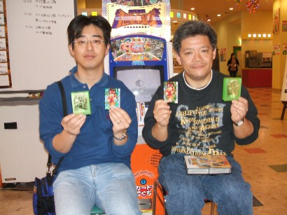 この日,17回目の結婚記念日を迎えました。記念日に,息子から何かもらいたいところ。その何か・・・もちろん優勝カードなんですが・・・。朝,ムシ大会がありました。旭川から,初代エリアGC王のお子さんの家族ともうひと家族が遠征して来られ,32人大会がビッシリ埋まるという,活気ある大会になりました(^^)。さて,抽選の結果・・・なんと開幕試合で私と嫁さんがいきなり対戦!ムシの神様もわざわざ結婚記念日に,そういう配慮をしなくていいのに・・・なんて思いながら(^^;),嫁さんを撃破。でもこの日は,このあと行われる恐竜ペア大会にみんなの気持ちが行っていて,ムシにちょっと集中しておらず,私とて例外ではないですから,2回戦で早々に姿を消しました(^^;)。息子は,昨日の失敗をまた繰り返して3回戦敗退です(呆)。さて,その分気合が入った恐竜ペア戦が12時からありました。仲間内でシャッフルして,私は「記念日といえばこのお方」タカユキさんとペアを組むことになりました(^^)。タカユキさんの結婚記念日にペアで優勝できたり,私のメモリアルな優勝をペアできめたり,不思議な縁があります。まず息子のペアですが,1回戦勝ったあと,2回戦で嫁さんのペアと対戦。ここでなんと嫁さんが1頭勝ちをして,準決勝へ進出です。私のペア,初戦はタカユキさんが頑張ってくれて,私はノドで必殺一発だけで勝ちました。2回戦,タカユキさんが先勝ち。私も出ましたが,あいこの連続からひとつ勝ってショック発動となり勝ちました。準決勝,ここも2回戦同様ショックがいいところで発動し勝つことが出来ました。決勝,反対側から上がってきたのは,相棒の活躍で準決勝を乗り切ってきた嫁さんのペアでした。結婚記念日に恐竜の神様は決勝で対戦という,ムシの神様に比べたらはるかに嬉しい配慮をしてくれました(^^)。ですが,ちょっと心配なことが・・・。タカユキさんが実は嫁さんにムシでも恐竜でもここのところずっと負け続き。順番を変えることも考えましたが,こちらも好調なだけに出る順番はこのままでいきたいところ・・・なんて思ってるうちに対戦開始。嫁さんのデッキは相棒の子に選んでもらったようですがブリッツ。タカユキさんは・・・アクア装備で・・・ああ属性負け(^^;)。どうなるかと思ってましたが,やはりショック+チェンジ+アクアは属性負けなんて,「そんなの関係ねぇ!」って感じですね。いいところでライフチェンジもきまって,タカユキさんは嫁さんに勝ちました!(^^)そして相手2頭目が出てきたところでいきなりライフチェンジ成功!一発勝ってショック発動。そのまま押し切り・・・なんと私の出番がないまま優勝となりました!やはりメモリアルな日にはタカユキさんとのペアに限ります(^^)。14時からは今度は店がペアを決めるランダムペア戦。私は高校生のクルミちゃんと組むことに。嫁さんのペアは初戦敗退。息子のペアも息子の頑張りがきかず初戦敗退でした。私のペア,クルミちゃんにブレイクやブリッツを使ってもらいながら勝ち進みます。あいこでも勝ちのブレイクや,負けても勝ちのブリッツはいい感じですね。そして,本日2回目の決勝進出となりました。クルミちゃんにはブリッツを使ってもらいました。相手1頭目をすぐに倒してしまい,迎えた2頭目,ここも連続攻撃をしかけます。相手に終盤ひとつ負けますが,ここで雷の力がみなぎります。相手はあいこでも倒れる体力でしたが,次あいことなり,勝負あった!・・・と思いきや,相手の竜が気合で立ち上がってきました!そうです,相手はふっかつタイプの化石竜を使っていたのです(^^;)。相手にかすかな体力が残りましたが・・・そうです!まだ雷の力がみなぎってますから,ここで勝っても,負けても,あいこでも勝ち。優勝確定!最後の一手は負けましたが,ブリッツ発動!なんと,このペア戦も決勝で私の出番なく優勝となりました。さっきの優勝でリュウタの優勝カード,この優勝でレックスの優勝カードをもらいましたので,私個人で優勝カードをコンプすることができました(^^)。3回の優勝でコンプですから,効率がよかったです。このあと場所を変えてムシのランダムトリオに出ましたが,3人のトリオともいいとこなし。結婚記念日だというのに,ムシの神様は冷たいですね(笑)。このランダムトリオの前に行われたムシペア戦(うちは間に合わず)で,旭川の初代エリアGC王のリュウヤ君が優勝し,見事スーパーGCとなりました。おめでとうございます!!!またランダムトリオでは,遠征されたもう一家族のなかでママさんが優勝となり,二家族にとっていい遠征になりましたね。おめでとうございます。また何回でも来て下さいね(^^)。大会が終わったあとはお決まりのスパへ。大会では何も活躍しなかった息子が,一番楽しんでました。まあ,結婚記念日に夫婦がどうのというより,子供が楽しんでいるところを見るのが一番かな,なんて思ってしまいました(^^;)。