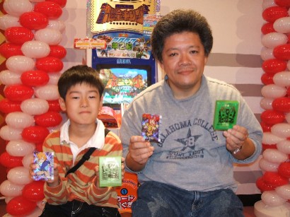 月曜の大会で私がマルムをゲットしましたが,この週末,なんとか1勝して違う恐竜王カードをゲットしたいところです。まずは朝,ムシ大会がありましたが,苦手のちっちゃい子に,嫁さん,私,息子がそろって倒されました(^^;)。出さないと思ったら出すし,回るかと思ったら止まるし(笑)。気を取り直して12時から恐竜ペア戦。気の合う仲間でシャッフルして,家族3人それぞれペアを組みました。いきなり私と嫁さんのペア対決。嫁さんペアの先発だったちっちゃい子のパキケに私のペア2人が瞬殺されました・・・。その嫁さんのペアも,初戦勝ちあがってきた息子ペアの先発息子に瞬殺されました(笑)。息子ペアの準決勝,ここではうまくふうじを入れたアロの戦い方が分かったか,息子の1頭勝ちでした。決勝,先発息子はそっこうスピノにショック。相手を攻め込み,終盤あいこバクダンを2発つけたところでショック発動。あいこなら・・・という場面で,相手もパウパウがいるから負けに入り,勝って相手パウパウ発動。まあ仕方ないか,でもあいこなら終わりだと思っていたら,息子必殺きめてやれやれ・・・と思ってたら!アッと驚くタメゴロー・・・ナヌ?パウパウがまた出てきやがった!こんな決勝という,しかも決めの一手で出てくるなよ・・・。こうなりゃショック発動しろーーー!と祈りましたがショックは出ず。次,あいこで勝てたからよかったものの,負けてたら相当なショックを受けるところでした(^^;)。相手大将にあいこ一発で倒され,こちらも大将ユキナオ君に交代。ムシマスターのユキナオ君がうしろにいて心強い!(^^)あいこで相手を牽制しながら,決めの一手,完全に相手の裏をかいてました・・・。ということで!息子ペア,優勝することができました!(^^)優勝カードはユキナオ君のご好意で持っていないリュウタをもらいました。2回戦と準決勝は息子も活躍しましたが,初戦と決勝という大事なところでのユキナオ君の活躍,ありがたかったです。14時は恐竜ランダムペア戦。こんどは店が抽選でペアを決めていきます。嫁さんのペアは初戦敗退。私のペアは危ないところをかいくぐり,準決勝までいきましたが,そこで息子ペアと対戦。先発同士は息子ペアの先発が勝ちます。私の出番。一手で相手先発を倒しましたが,ここで親子対決。悪いけど普段言っていることの裏をかかせてもらうよ,って感じでやってましたが,裏の裏をかかれたのは私の方で(笑),息子に完敗でした(^^;)。息子,本日2回目の決勝。決勝の相手は大人ペア。先発がすぐに倒されます。息子はなんとか体力半分くらい残して相手大将を引っ張り出したいところ。そっこうメガラプトル+ふうじ+サイクロンですから,それくらいの体力があれば,もしかするともしかしてということで・・・。なかなか攻められませんがサイクロンのおかげもあって,イエローで相手大将を迎えます。ふうじをちらつかせながら相手パキケと戦い,途中負け必殺もきめ,ほぼ互角の戦い・・・かと思いきや,そこから攻められ,パキケにかいふくされ,パキケ体力半分,息子あと・・・あと・・・おい!体力残ってるのか!って感じの状態に。もうあいこで終わりだなと覚悟したとき,息子に何か閃いたのでしょう。息子は唯一爪のついた負け必殺パーを放り込みました!勝負の行方は!アッと驚くタメゴロー・・・ナヌ?グー!?相手パパさん,息子に負け必殺はないと確信してのグーを出していて,息子ペア,逆転で優勝となりました(^^)。優勝が決まった瞬間,ふりむいた息子の目も鼻の穴も,これでもか!ってくらい広がってました・・・(@。。@)←って感じ(笑)運良くレックスがあったのですが,チヒロ君がいいよって言ってくれたので,これで我が家は新恐竜王カードをコンプすることができました(^^)。ひとりがコンプするのなんて大変ですから,我が家はこれで大満足です。場所を変えて家族ペアに出ましたが,そこでは息子の出来が最悪。それ見た私の手も最悪。本戦も,負けて出た敗者復活戦も初戦敗退でした。夜,大人戦があり,2回戦から登場の私でしたが,そこでまず負けた場合にもらえるカードが筐体から出てきてビックリ!アッと驚くタメゴロー・・・ナヌ?パキケ!ああ,前にも嫁さんがパキケをもらい損ねたよな・・・どうしようかな・・・ボタン押さないかな・・・相手のパパさんに悪いかな・・・でも欲しいよな・・・なんて考えながら戦ってましたが,こちらデスつきのアリオ。相手もデス使ってて,途中相手にデス発動。食らいたい!!!って思いましたがあいこ・・・(^^;)。あとから聞きましたが,ここで相手パパさん,何かふっきれたそうで,勝ちに来ず,あいこの連続で私,勝ってしまいました(泣)。でも,相手パパさん,あいこパキケ持っていなかったということで結果オーライですねよ・・・。オーライ・・・オーライ・・・ライ?・・・ライ!ラララライ!ラララライ!パキケファロでエクササイズ!なんて,泣きながら踊りたくなりました(笑)。さてその後の対戦は,私は準決勝で負けましたが,反対側から決勝に上がってきたの
