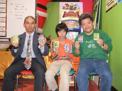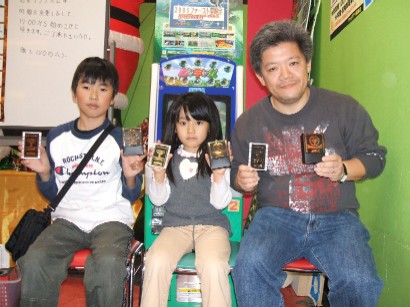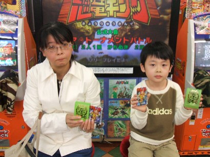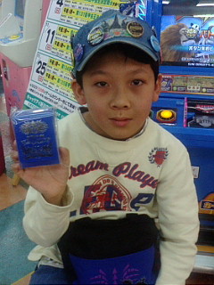 昨日はランダムなのに家族でトリオになったり,決勝進出すらなかったという暗い1日でしたが(^^;),そのランダムトリオのとき,3人が引いた番号「777」が,まさかこんなことの布石になっていたとは・・・まず11時からキャッツ篠路にて,いまや貴重なムシキングランダムトリオ戦(120限定)。私のトリオ,1回戦勝利したあとは息子トリオと2回戦であたりましたが,大将戦で私の勝利。準決勝では今度は嫁さんのトリオとあたりましたが,ここも大将戦を乗り切って勝利。さて決勝,先発のマナちゃんが相手先発を倒しお役御免,2番手のカイト君に交代。カイト君,冷静に相手2番手を倒し,迎えるは相手大将。勝ちムシのカイト君,慎重に手を出して・・・出ました,究極必殺!相手大将はレッドになり,このあとカイト君は押し切って・・・決勝は私の出番なしで優勝となりました(^^)。次は13時から,恐竜ペア戦です。仲間内の抽選で私はリエさんと組むことに。1回戦,2回戦と勝って準決勝,嫁さんペアとの対決になりました。反対側のトーナメントでは,息子ペアが早々に決勝進出を決めていて,この時点で家族の誰かが優勝,そして準優勝が確定です(^^)。嫁さんとの準決勝は,リエさんがうまく1頭勝ちをしてくれました。さて,決勝,息子対リエさんは,息子の拙攻もあってリエさん先勝ち。相手大将をイエローにして,私と交代ですが,相手草を読んで「そっこうアロ+カマイタチ+チェンジ+トルネードブロー」で行きました。ですが,相手はスピノ・・・負けてショックが発動してまた負けて・・・。追い詰められました私,両者全爪まで行き,ここでチェンジをちらつかせてのグー!結果は・・・相手大将チョキで,私のペア,優勝となりました(^^)。結局息子が準優勝という結果に・・・。ムシと恐竜で私が優勝・・・なんか運気急上昇?昨日の「777」がこんなところでフィーバー?もしかして?もしかして?14時半の恐竜ペアはビンゴが終わってからということで17時に変更(いいことですね ^^)。さぁぁぁビンゴ大会だぁぁぁ!カードをもらって臨戦態勢。読み上げられる番号・・・いいぞ,いいぞ!ビンゴ!!!・・・って他のお客さん(笑)。私や嫁さんのはリーチがかかるものの,あとひとつがなかなか出てくれません。賞品がどんどん捌けていく・・・あぁぁぁ米が当てられた・・・OTL結局15時のビンゴは何も当たりませんでした・・・運気は使い果たしたか・・・16時は恐竜トリオ戦です。私のトリオは初戦で息子のトリオを,先発の1頭勝ちで破るものの(流石AHパパさん! ^^),次で負けました(^^;)。嫁さんのトリオ,嫁さんに「そっこうスピノ+あいこアタック+よこく+アクア」で行かせましたが,うまくよこくも成功し,アタックで削ったところに必殺をきめて相手先発を倒します。この勢いで2番手のリエさんもいい感じで相手を攻撃し,大将ムツコさん温存で決勝へ。決勝,嫁さんにトロを持たせましたが,相手先発を倒し,まずまずの滑り出し。相手2番手に負けますが,リエさんの攻撃はすさまじく,チェンジをちらつかせてうまい攻撃。相手大将に必殺も浴びせて・・・決勝も大将ムツコさんを温存したまま優勝となりました(^^)。・・・まだ運気は上昇中?このあとすぐ,順延となっていたペア戦をやりましたが,私のペア,初戦で息子のペアを,先発パパさんがひとりで破り,2回戦もまたまたひとりで破ったんですが,準決勝で私が出た途端,足引っ張って負けてしまいました・・・(^^;)。嫁さんペアもいいとこなし・・・ここまでかなあ・・・。今日はいいとこなしの息子ですが,全部私に負けてるし,まあ勝てっていう方がムリでしたね(笑)。一旦食事のために店の外に。昨日発売の遊戯王のカードを箱買い。ユベルが入っていたとかで喜ぶ息子です。夜のビンゴのために篠路に戻り,そこで時間が少しあるので連コを少々。なんの連コかといえば・・・プリキュア(笑)。ワンレアまでやるつもりでしたが,3千円ほどで出てきたのは・・・MRキュアドリーム!これでプリキュアもコンプになりました。さあ来い大会!(笑)。そして・・・夜のビンゴ大会だぁぁぁ!昼より人は少ないものの,それであたるかといえばそうでもないですよね。読み上げられる数字。またいい感じだぞ・・・あ,ビンゴだ・・・他の人が(笑)。賞品は出て行くものの,1等の米はまだ残ってる・・・よし,ダブルリーチだ!さあ来い10!18!「あと賞品は3つでーす。1等は残ってまーす!」という店員さんのアナウンス・・・焦る・・・。次の番号は・・・18 キターーー(@。。@)ーーーッ!ビンゴだ,ビンゴだ,と前へ出て行くと,なんとそこには私を含めて5人のビンゴ者が。5人でジャンケンして,勝った3人はビンゴでくじを引けますが,負けた2人はお菓子・・・ジャンケンポン!負けた・・・でも勝ったのは2人で,あと1枠ある!!残った3人で,再び最初はグー,ジャンケンポン!私チョキ,残りの2人パー・・・見たか!ムシキング魂!(爆)まずはじめに勝った2人がくじを引く・・・はじめの一人・・・体重計当選・・・セーフ!残るは5等のなんかディズニーのなにかと・・