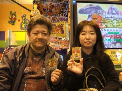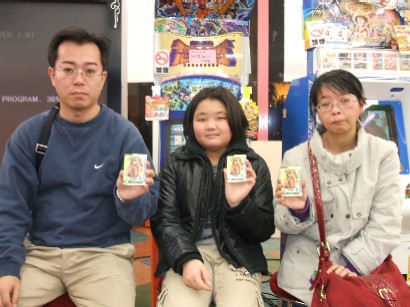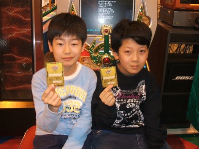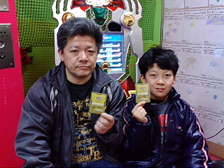 皆様あけましておめでとうございます。本年も我が家,そして当ブログをよろしくお願いいたします。1月1日・・・元旦に恐竜キングのトリオ戦がひとつありました。午後3時からだったので,ちょっと早めに家を出て,イオンに行ってきました。目的はガンバライドのキャンペーンだったのですが,3台とも親子が遊んでいるようだったので,とりあえず撤収・・・。ふと見ると「福袋」の文字が・・・2万円でDSi本体とソフト(ちょっと古い?),そしてポーチがついています。いま息子が持っているDSもボタンがちょっといかれてるって言ってたので,衝動買いしてしまいました(^^;)。これは息子へのお年玉?いやいや,単なる「グランプリ通過のご褒美」でしかないのです・・・。恐竜トリオ戦が行われる店に到着・・・当然息子は「マーニャ」のレベル上げに。3台ある筐体はビッシリ人がついてましたが,カード切れになる台もあり,1クロ目が気になるところです(^^;)。恐竜大会が始まりました。息子トリオ,初戦,先発の子が相手大将まで引っ張り出す活躍を見せてくれたのに,2番手で登場した息子が大ブレーキ。勝負をしかけるどころか逃げまくるような出し手に終始。相手大将を何ら追い詰めることなくこちらの大将と交代という嫌な流れをつくってしまい,大将もどうにもできずに負けとなりました。あまりにも不甲斐ない息子に対し,私はここで息子にお年玉・・・いや,雷の「落とし玉」ということで,「大目玉」を新年一発目から食らわすことに。私のトリオですが,初戦は大将同士の戦いになり,最後の一手勝負を制して2回戦へ。2回戦は先発ママさんがDTスピノでうまく1頭勝ちです。嫁さんのトリオは,初戦は先発の子と2番手パパさんで勝利・・・なんと嫁さん大将(^^;)。2回戦は,大将戦になりましたが,属性勝ちとなった嫁さんがうまく切り抜けて勝ちました。準決勝は私のトリオと嫁さんのトリオの対決となりましたが,ここは嫁さんトリオが,嫁さん温存で勝利し,決勝進出となりました。決勝,先発の子が頑張って相手先発を倒し,そして2番手パパさんも頑張って相手大将を体力半分弱(ジュン! ^^;)にしたところで嫁さんの出番となりました。相手そっこうスピノに対し,嫁さんはJAギガス・・・ヒートが2回出れば・・・。初手,そして2手目も負けた嫁さん超ピンチ・・・相手全爪。次,相手のぬいぐるを消すことに成功。そして次手,あいこでこちらに待望のヒートが発動しました。体力的にはちょっと逆転しましたが,それでも最後の一手勝負・・・結果は・・・嫁さんの出したチョキにより勝利!嫁さんトリオの優勝となりました(^^)。先発のユカちゃん,そして2番手のケンイチさんの頑張りによって,なんとか嫁さんも大将として働くことができました・・・サインはV(^^)2009年一発目の大会で優勝できて何よりです。さて,大会が終わると,またもや子供たちはドラクエでレベル上げ。息子に遊ばせている私の冒険の書も,戦士や魔物使いのレベルが30近くになりました。帰り間際,さっきパックが代わった台ですが,いいだけ子供たちが遊んだにも関らず,まだクロが出ていなかったので,ちょっと「商人」に登場してもらい,確認することに。そしたら出てきたのは・・・「まじんのよろい」先月3日の先行稼働直後出まくった「まじん」ですが,その後はどうしたものかピタッと出なくなって,逆に息子は欲しがっていたので,ちょうど良かったです。帰路の途中イオンに寄り,誰もいないガンバライドで連コしたら,4枚目に「当たり」が出て,ガンバライドの組み立て式カードゲースをもらうことができました。元旦・・・1年の計は元旦にありですが,今年は大会で嫁さんが活躍し,息子にはしょっちゅう雷を落とすことになるんでしょうか(^^;)。それでもいい1年であって欲しいと思います。皆様にとってもいい1年でありますように!