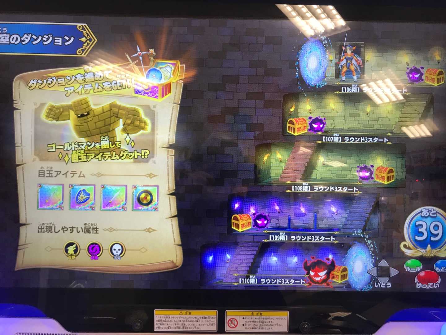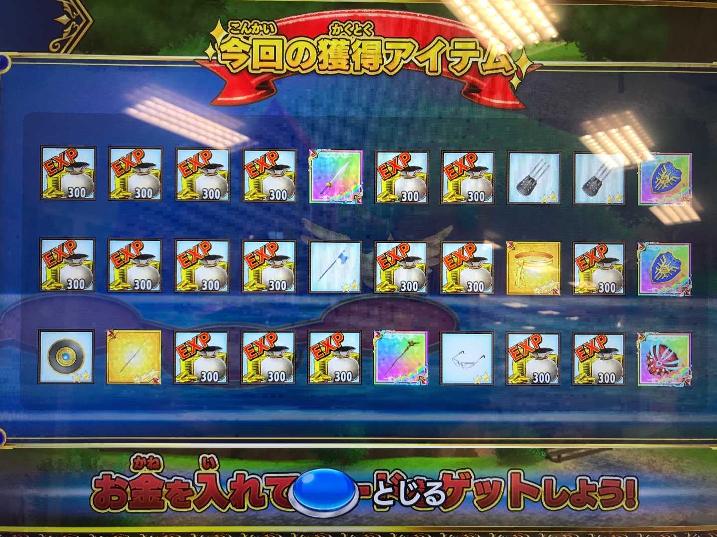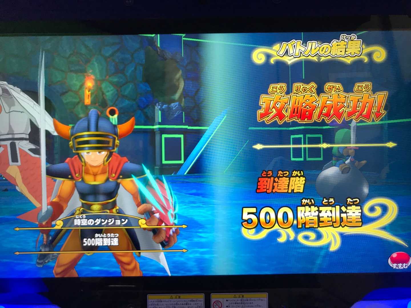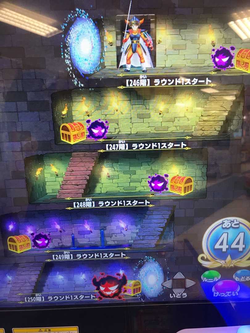 クロスブレイド時空のダンジョンでゴールドマンが出た階数と報酬をまとめますと・・・15 ラダトームのつるぎ32 カールの盾48 ラダトームの盾52 ステテコパンツ70 アバンの書102 ロトのつるぎ128 ロトのつるぎ144 ロトの盾153 ロトの盾160 ロトのつるぎ178 ロトのつるぎ181 ロトの盾これ以降、300階になるまで1回もゴールドマンは出ませんでした。これはどう考えたらいいか・・・私が時空のダンジョンをやってると知った運営が、私の装備ランク上げを邪魔するためにドロップ確率を落とした?(笑)ソシャゲもそうですが、金を使うプレイヤーにはアイテムを出辛くするってのは常套手段ですからね。ソシャゲもどきのクロブレがそういうことをやらない訳はないと思いますが・・・。6000円使ってゴールドマン12回・・・前にも言いましたが、激しく散財するイベントだと思ってます。思ってますが、ロトのつるぎや盾は、このイベントかカードを買うでしかドロップしないのならやらざるを得ないですね・・・ランク上げを止めればいいだけなんですが(^^;)。 左上の階数表示も4ケタまで表示出来そうですし、9999階まで行けるのかな?こんなだから時空ダンジョンは7月21日までって5弾の稼働日を越えてでもプレイさせたいって運営が思うはずです。ま、5弾の稼働日は6月24日だと思ってますが、人知れず7月22日にずらしたのかも知れませんが。となれば、8月の関東大会で稼働終了の告知をして10月からイカレた筐体が撤去されて行くというシナリオも?4弾が3か月、5弾が3カ月でちょうどいいですから(^^)。