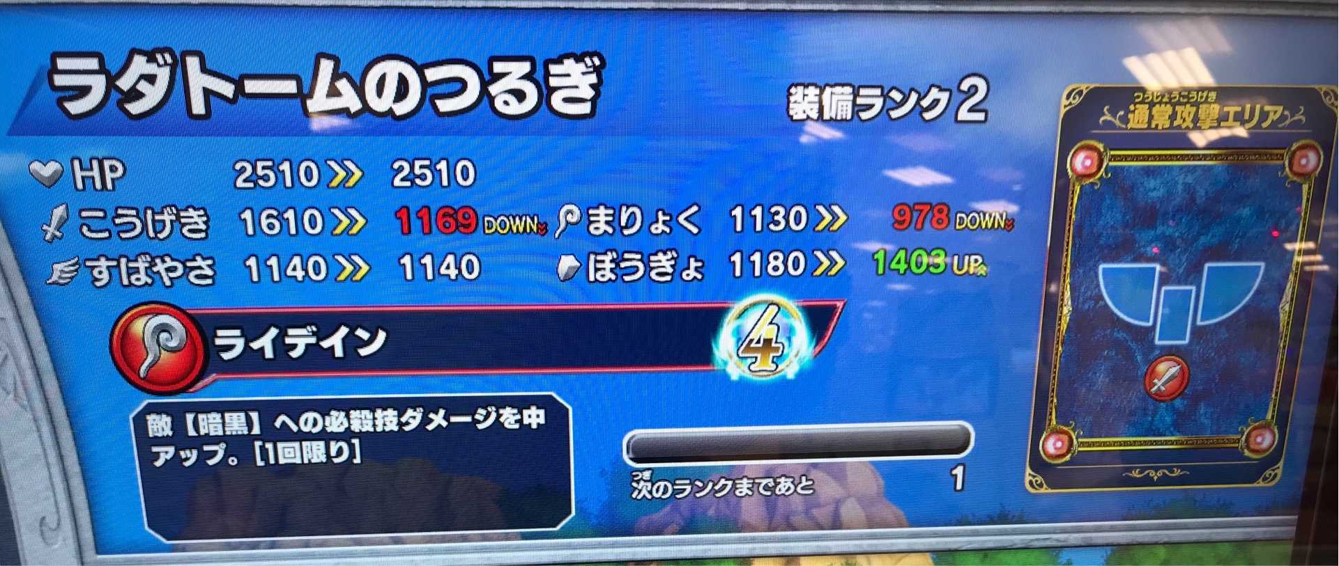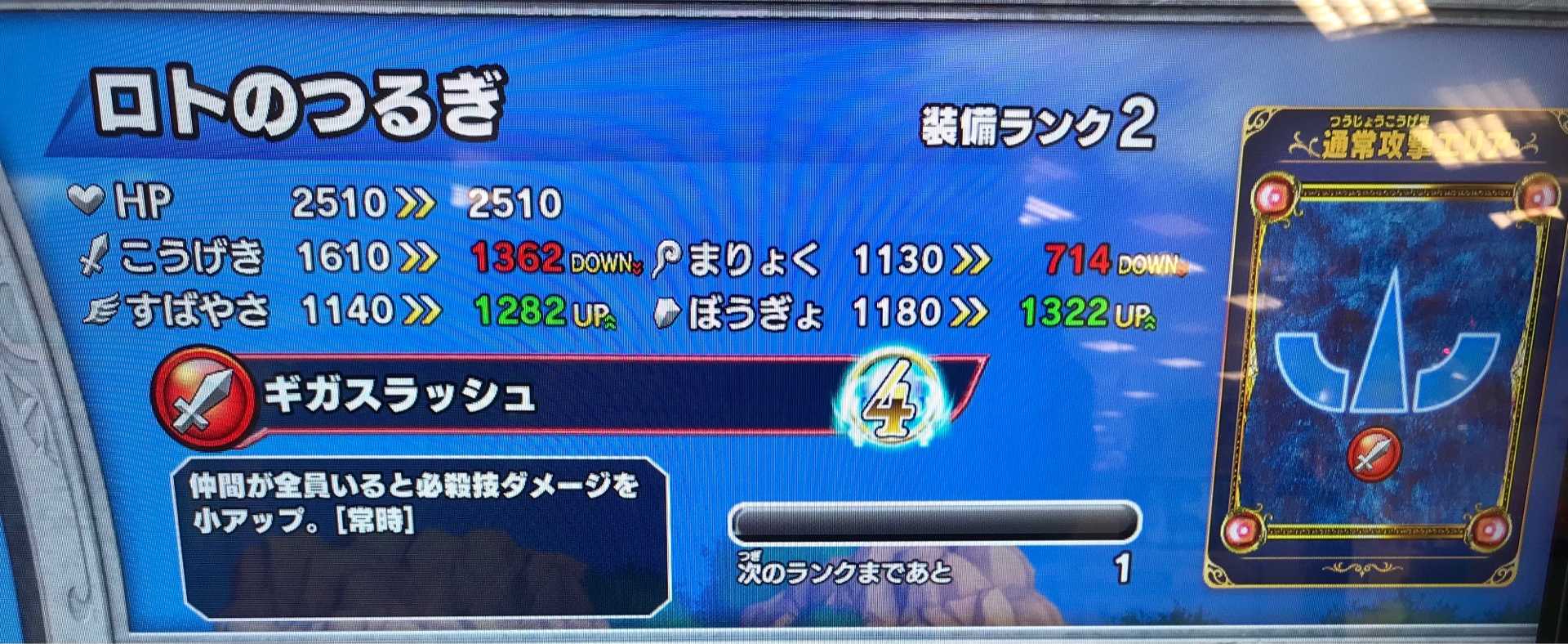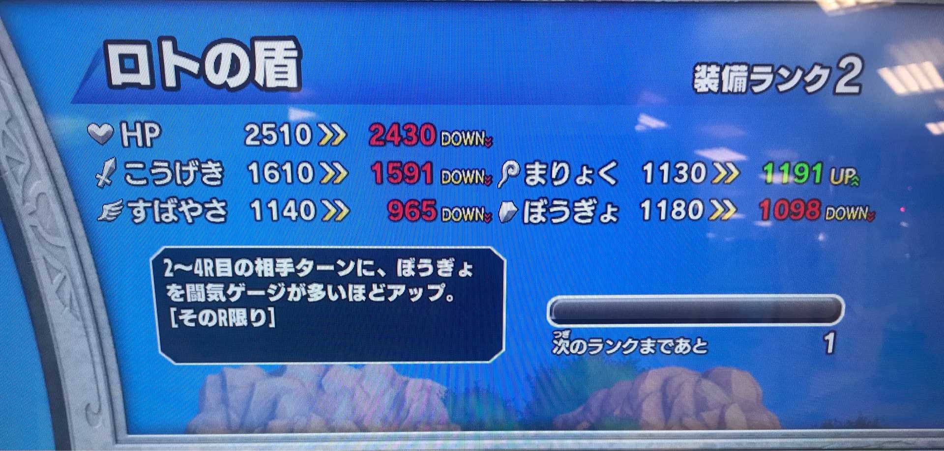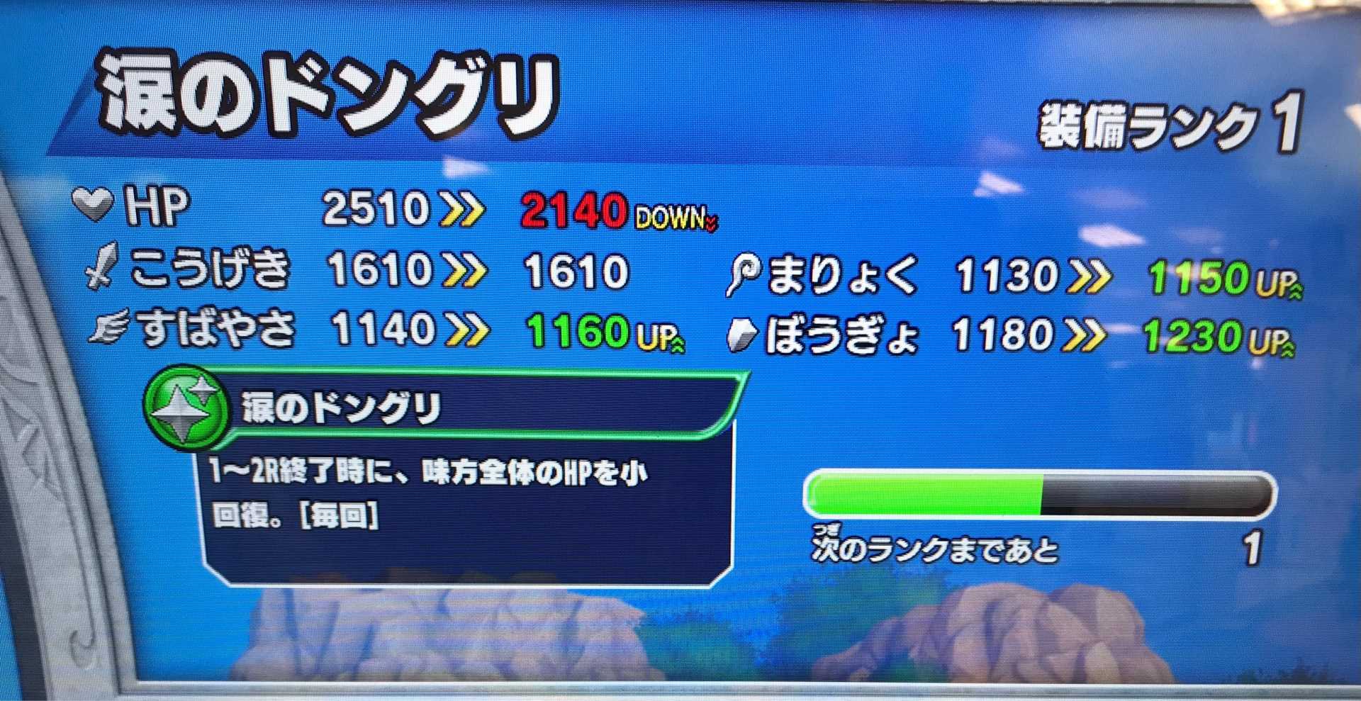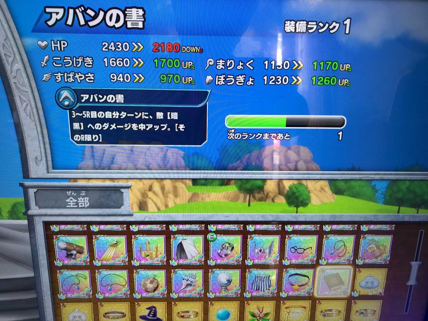 クロスブレイドホント地味な作業だわ・・・ザボエラの水晶が装備ランクMAXになりました!敵のこうげきをダウンさせるのはいいんだけど、「ゆびわ」以外にアクセがひとつしか装備出来ないから、こういうアクセも装備しづらいんだよね。アクセも4つくらい装備出来るようにしてくれませんかね?運営さん! で、いま周回してるのは・・・とっくの昔に装備ランクMAXにしている「杖」や「爪」が出過ぎて『アバンの書』が全くと言っていいくらいドロップしない。『アバンの書』なんて、目玉アイテムのはずなのに、虹色報酬のなかでわざわざ右端に持ってきてるし(左端がドロップ率高めで右端は低めに設定されてますね)、ドロップさせる気が無いのは明らか。そして虹箱が出るならまだしも、ハドラーを倒してるってのに、銀箱やら金箱しか出ず、結局「経験値」しか増えないなんてザラ・・・そんなだからキッズが嫌気差すんですよね一生懸命戦って、負けるからコンテして、数百円使ってボス倒して出て来るのが銀箱って・・・報酬に虹箱を3つも並べておいて、最後に「虹箱が出るって思ったお前の負けぇぇぇ!」と言わんばかりに銀箱を突き付ける。まあ、そもそも最後にボスに勝たないと、それまで装備の箱が何個もドロップしていても、アイテムは一切もらえないってのが大問題なんだけどね。「100円返せ!もうゲームやらね!」って気になるでしょうよ。そういうことだよね!