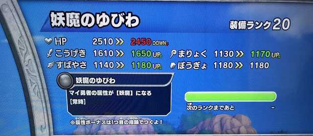 クロスブレイド装備って、MAXになってなくても20個より多くドロップさせると装備のアイコンに虹色の冠が付きますよね。いま現在、武器や盾は装備ランクオールMAXですが、アクセサリーが「2つ」まだMAXになってません。それでもその2つのアクセに虹色の冠を付けることが出来ました。どれがランクMAXでない2つのアクセかは読者の皆さんは分かりますよね?(^^)いまは装備オール虹冠ですが、今後矢継ぎ早に虹色装備が出て来るので、ランクMAXも大変ですから、虹冠つくまで集めてそれで終わりでもいいかなあと思ってます。画像の装備一覧を見ただけじゃ、装備がMAXなのかどうか分からないし、マイ勇者の装備画面を見ても虹冠がついてるのは分かってもランクって分からないですし・・・。せめて昔のモンバトのように・・・モンバトのオール赤目大魔王99体撃破達成したときの画像ですが、こんなふうにアイコンの隅に現在のランクの数値を記してくれればチェックも楽だし、周囲へのアピール度も違ってきますよね。 しかし、なぜMAXまでドロップ70の装備も、ドロップ35の装備も両方ともドロップオーバー20で同じ虹冠が付くんでしょうね。「がんばりましたで賞」だとしても、なんかよく分からない・・・あ、運営が深く考えずテキトーに設定したってことなら凄く納得出来ますね(笑)。