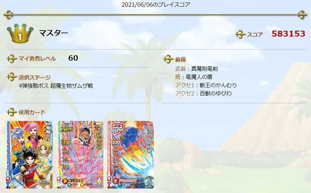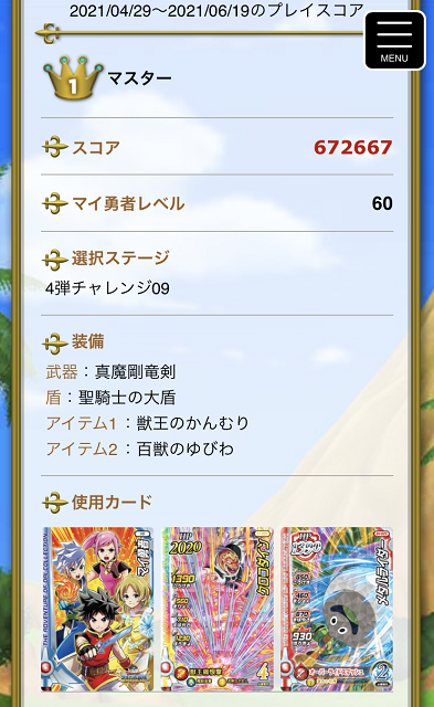 クロスブレイド昨日のスコアがデイリー1位になるとともに、2弾以来の『弾別1位』となりました。4弾終了までにまだ数日ありますので、順位はこの先少し下がるかも知れませんが、さすがに50位以下にはならないでしょう(^^)。しかしさあ、途中経過も含め、弾別で1位を獲るなんて何十人もいる訳ないんだから、弾別の1位経験者は夏の関東大会は飛行機代とか宿泊費をスクエニ負担で全国から来てもらうって企画したらいいのに。モンバトのときは各地域エリアで優勝した人を東京に「招待」したんだし、同じことしてくれよ、市村さん!エリア大会が無い以上、それに代わるものとして「弾別ランキング」の成績で呼んでちょーだい(^^)。 そして今日はとうとうこの装備が整って・・・ザムザのマントが装備ランクMAXとなり、これで『装備ランクオールMAX』となりました!頑張ればMAXになるもんですね(笑)。でも、緊急事態宣言下で開店しているゲーセンがあったからオールMAXになりましたが、これで土日休業だらけなら、装備なんていくつ中途半端なランクで4弾終了となったか分かりません。明日から札幌はマンボウに移行ですが、もう土日休業じゃないと思うので、5弾はまたボチボチ頑張りたいなと思ってます(大会も開催されるでしょう ^^)。