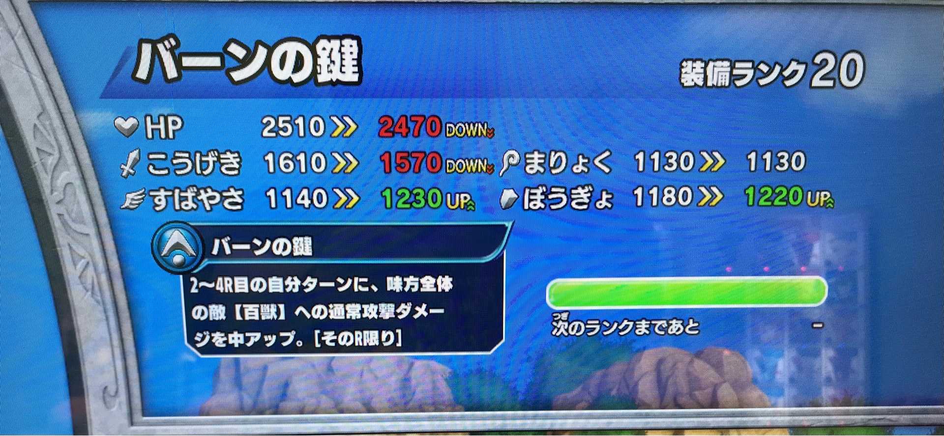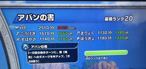 クロスブレイド今日の装備ですが・・・アバンの書が装備ランクMAXになりました!これで一段落というか、5月29日に色々装備が追加になりましたけど、それ以前の装備については装備ランクオールMAXです。あとはロト装備やラダトーム装備、りゅうおうの杖をMAXにしたら、明日以降登場する装備のランクを無理に上げなくて済むと思えば非常に気が楽です(^^)。 でも・・・ドングリはどうするかなあ。ま、金色装備だし、時空のダンジョンでしかドロップしないなら無視するかな。もうそろそろ時空のダンジョンもプレイしなくてもいいくらい目玉アイテムの装備ランクは上がって来てますし(^^)。
