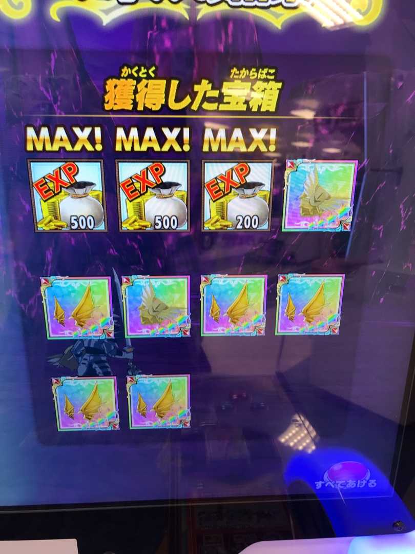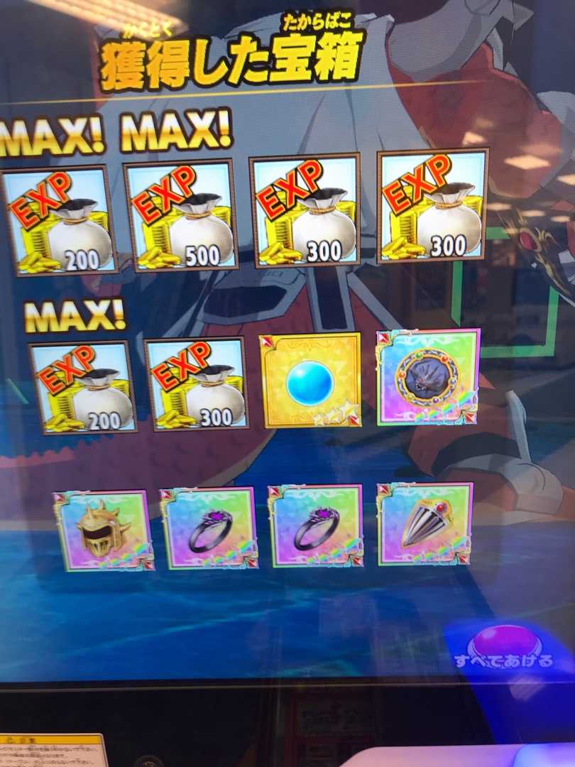 クロスブレイド 超越魔王の頭飾りもMAXになりました。 強敵ボス・ギガつよのように、虹箱が確定しているステージでは、追い銭は力を発揮しますね^_^