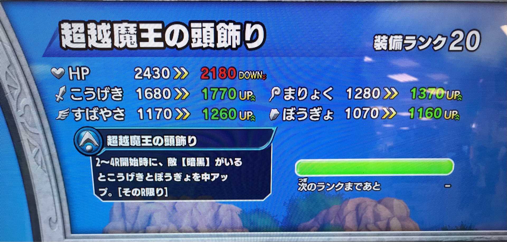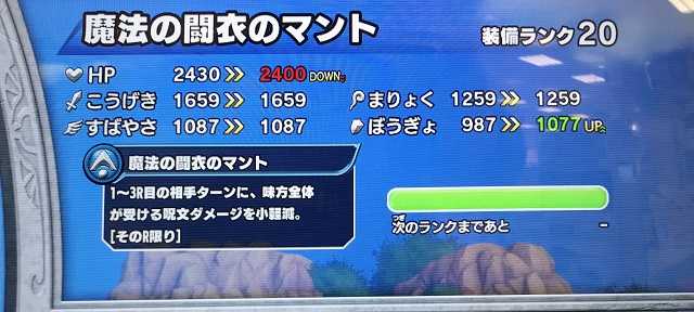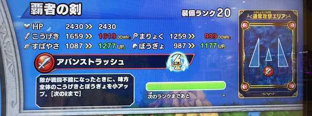クロスブレイドいやあ、新装備をドカドカと出されるのはそれはそれで辛いけど・・・今日開放されたストーリーのステージや、先日からの不死チャレンジなんかもそうだけど、カビの生えた装備とか出して来るのは何故なんだろう。強敵ボスでは一応新装備を出してるけど、ストーリーやダンジョンのつまらなさって・・・これはあれかな、アニメとの連動を過度に意識するあまり、ゲーム的に前に進めないのかな。この期に及んで古臭い装備を出さなくて済むよう、もうちょっと長期的ビジョンに基づいて装備を世に出せばいいのにね。いつも行き当たりばったりだから・・・時空のゆがみもちょっと褒めたら全然出現しないし、超越魔王の装備も落ちなくなりました。でもね、実は「超越魔王の盾」はしばらく出なくてもいいんだよね。これ以上ランクが上がったら攻撃力が強くなりすぎて、スコアタがやり辛くなるし(笑)。 そんななか、今日はこの装備が整いました。覇者の剣が装備ランクMAXになりました!真魔剛竜剣よりこうげきが40下がるのはちょっと痛いですね(すばやさアップは魅力的)。こうげきとぼうぎょがアップなのはいいんですけど。 明日はマントもMAXに出来るかな?
