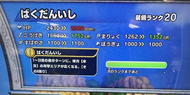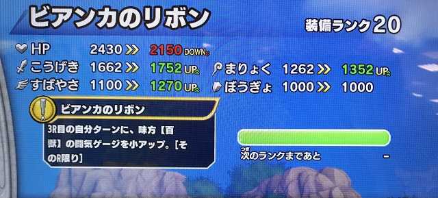 クロスブレイド本日の装備ランクMAXです!ビアンカのリボンが装備ランクMAXになりました!こうげき90アップや、すばやさ170アップは非常に魅力的ですが・・・闘気ゲージアップがなぜに「百獣」なんでしょうかね(ビアンカって百獣と何か縁が?)。 さて、これでいまランクを上げられるのは「ばくだんいし」のみなんですが・・・それがゲット出来るのは「氷炎チャレンジ」!氷炎チャレンジの超つよは『虹色装備は出やすいが、虹色候補が3つあるため「ばくだんいし」が出る確率は低い』。つよいは置いといて、ふつうは『虹色装備は出にくいが、虹箱が出たら100%「ばくだんいし」ゲット』。さて、どっちが得か、よーく考えてみよう!って、考えても分からないので、10回ずつ「超つよ」と「ふつう」をプレイして「ばくだんいし」の出現確率を今夜くらべてみました!結果は・・・ どちらも3個ドロップでした!(笑)結論はどっちでもいいってなりがちですが・・・超つよはワンタンキルが出来ませんが、ふつうはワンタンキルが出来るだけに「時間」ということを考えた場合、「ふつう」に軍配が上がるってことになりますね。ただ、私は「氷炎のゆびわ」も「暴魔のメダル」も装備ランクMAXだからそういう結論ですが、まだMAXでない方は「超つよ」のほうがいいことは言うまでもないですね(^^)。で、10回で3個ドロップですから、70個落とすのに・・・234回のプレイが必要って計算に!次の魔影チャレンジも新装備が出ますが、同じ感じでしょうし、「ばくだんいし」と合わせたら冒険の書1枚消費してしまいますね。ということで、新しい冒険の書を2枚買って、クリアファイルをもらうってのが一番いいかもですね。