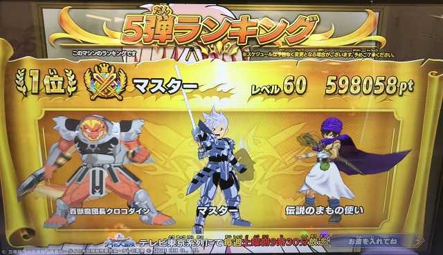 クロスブレイド装備も全てMAXにしてしまって、今日はやることもないのに、いつもの店に行き、いつもの台に座り・・・スコアタでもやるかと。なかなかいいフォーメーションになってくれない相手・・・それでも!またハイスコアを更新出来ました。いまはこの辺で良しとして、次の強敵ハドラーでまたスコアを伸ばせればと思うも、毎日3回くらいはやるかも。 ところで今日はこんなことがありました。いまのお宝アップって、筐体に最初に100円入れてそこでカード切れになればお宝アップは出来なくて倍率1倍のままゲームをすることになります。ただし、ゲームが始まってお宝アップで100円だけでも追い銭してそこでカード切れしたら、サービスってことでお金入れて無いのに必ず「倍率7倍」になります。だから400円入れたときにカード切れしたら一番もったいなくて(昨日の大会前に経験しました ^^;)、100円入れてカード切れしたら超ラッキー!今日は強敵ダムド戦で100円追い銭したときにカード切れして、超ラッキーだったわけですが・・・そんなときに限って闘気玉はとんでもないところに出て来るし、ミストバーン落とされた状態で強敵ダムド戦へ突入。オーレンやレオソードは倒したものの、体力十分なダムドにマイ勇者も倒され残りはさまよろのみ。宝箱は倍率7倍ということもあって30個以上あるのにヤバイよヤバイよ・・・これ、カード切れ状態じゃなければ普通にコンテすればいいだけなんですけどね。カード切れで行動不能になっても無料でコンテだけは出来てたのが、前弾からかな、カード切れで行動不能になったらコンテも何もそこで打ち切りになったんですよね。で、結局・・・さまよろは倒され、そこでゲーム終了・・・30個以上あった箱は一切もらえず消えてしまいました。こんなことってありか? これって前から言ってるけど、「一人プレイで負けたら宝箱もらえない」っていうの、修正すべきだって。負けても、そこまででゲットした宝箱は取れるようにしたほうがいいって。キッズのプレイで、お宝アップを期待して追い銭するって普通にあるだろうし、追い銭の途中でカード切れなんてのは日常茶飯事でしょうよ。そして必ずしも強敵ボスとかに勝てるキッズばかりじゃないし、いつもコンテしてようやくってキッズもいるなかで、「400円お金入れたのに箱はひとつももらえなかった」っていうのは可哀想だって!私は装備じゃなく、ちいさなメダル狙いで宝箱が欲しかったわけだけど、そんな私もショックだし、これは必ず修正すべき点だと思うよ。