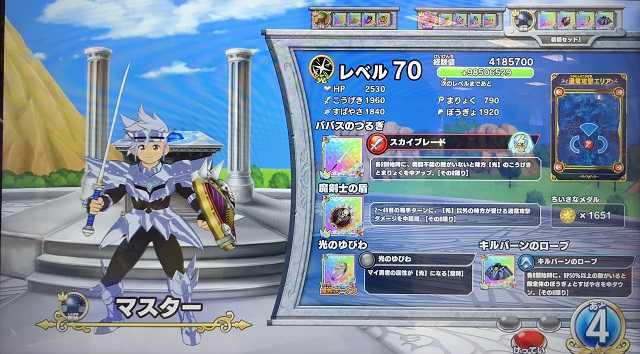 クロスブレイドメイロのところで新装備がありました。しかし、ダムドの○とか出しちゃマズイだろ?真5弾があるのは分かったけど。 そして死神が熟練度MAXになりました。このあとは時空の杖を使ってトーナメントで大魔道士の熟練度上げです。