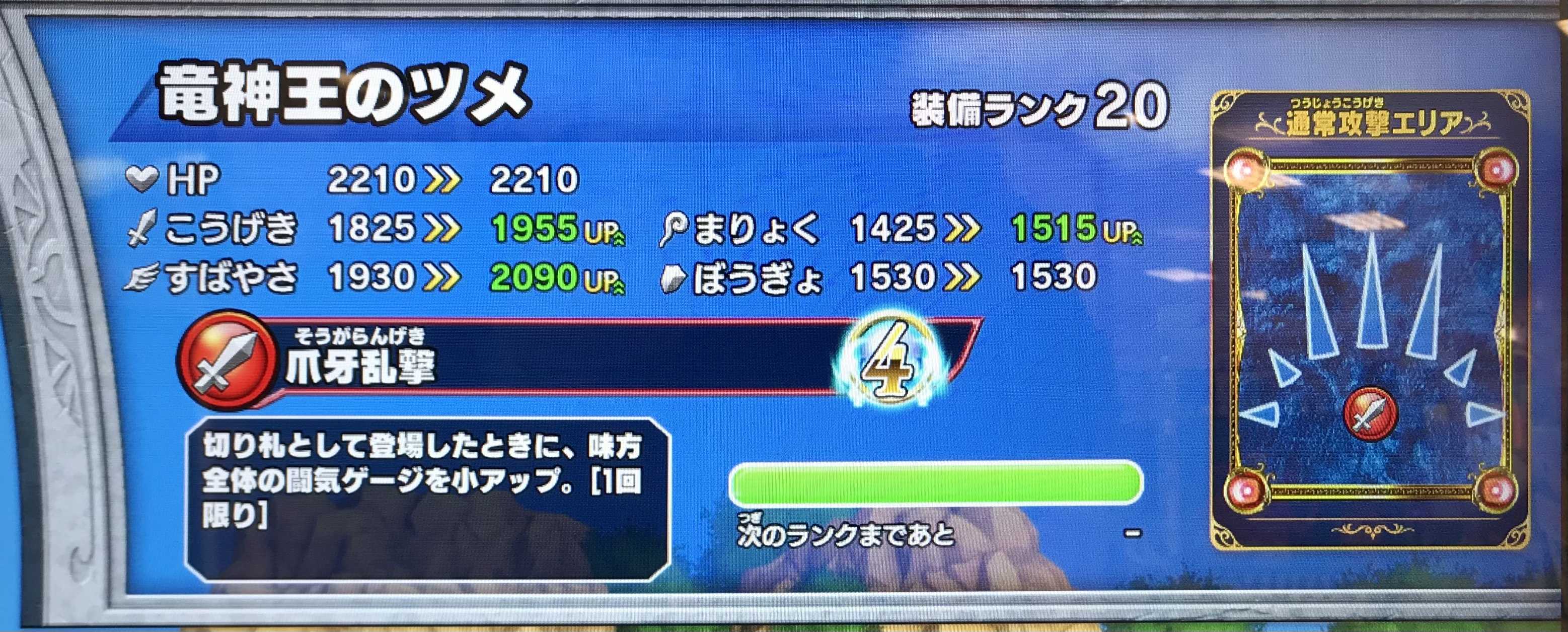 クロスブレイド大会前にツメだけMAXになりました。これ、あくまのツメとの比較ですが、ステータスは上がるものの、スコアタ的にはやはりあくまのツメかなと。