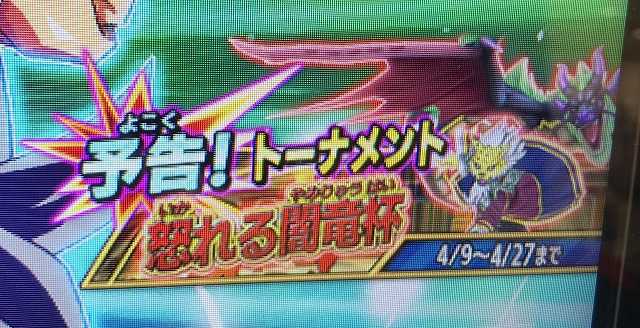 クロスブレイド4月9日から始まる「怒れる闇竜杯」ですが・・・公式HPでは開放期間が「4月9日~真3弾終了時まで」になってますけど・・・こんな筐体画面を見ちゃうと、真3弾の終了が4月27日だって分かる訳で。 なんか最近(でもないけど)クロブレの筐体はアバンの復活もそうですが、色々バラしてくれますね(笑)。運営も最早投げやりになってるっていうか、サ終に向けて「もうアニメに構わず一気に行ってしまえ!」てな感覚なんでしょうかね。 明日は店舗大会(スコアタ)がありますが、関東ではエリア大会もありますので、私は先週同様エリア大会に出てる気分で頑張ろうかと。先週は47万9千点で中部大会の予選を突破しましたし、明日は大会で48万点を突破したいものです(^^)。あとは腕輪を2個追加かな。